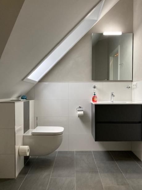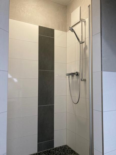 Ein modernes Badezimmer mit einer geräumigen ebenerdigen Dusche, beheizbarem Handtuchhalter und einem Föhn erwartet Sie.