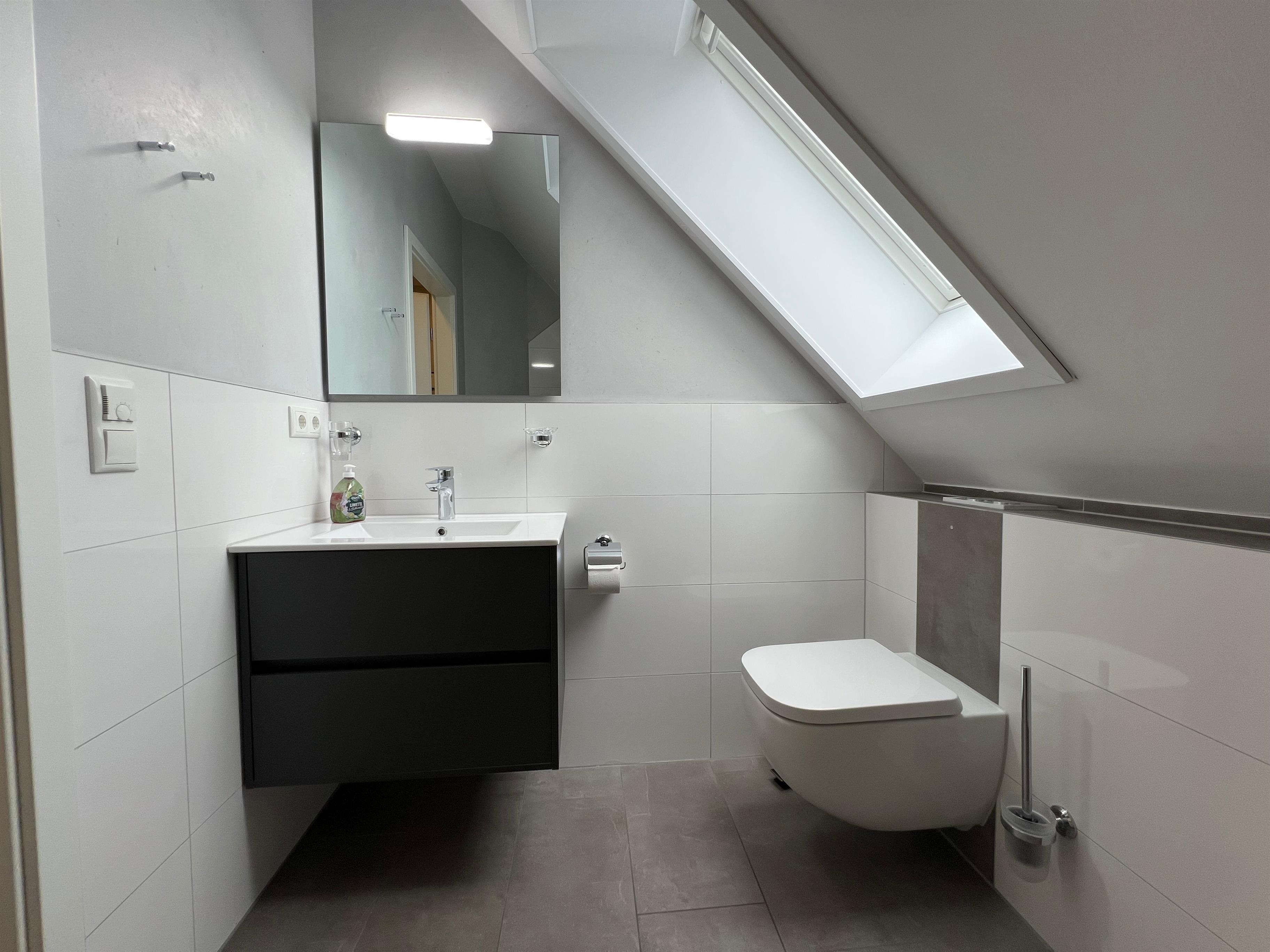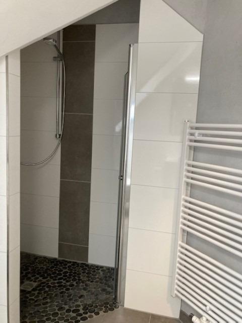 Das moderne Badezimmer verfügt über eine ebenerdigen Dusche, einen beheizbaren Handtuchhalter und einen Föhn.
