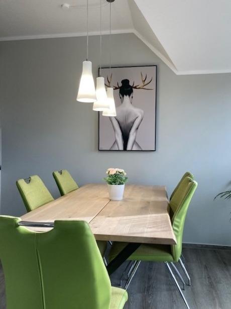 Es erwartet Sie ein helles und modernes Appartement mit Blick über die Dächer von Grömitz. Der großzügige Wohn-/Essbereich mit leichten Dachschrägen ist mit einem großen gemütlichen Esstisch und 6 Stühlen sowie einer hochwertigen Wohn/Schlafcouch (Liegefläche 160cm x 190cm) für zwei Personen ausgestattet. Die voll ausgestattete moderne offene Einbauküche verfügt u.a. über ein Cerankochfeld, über eine Mikrowelle, einen Kühlschrank, einen Herd auf Augenhöhe, eine Kaffeemaschine und einen Toaster.