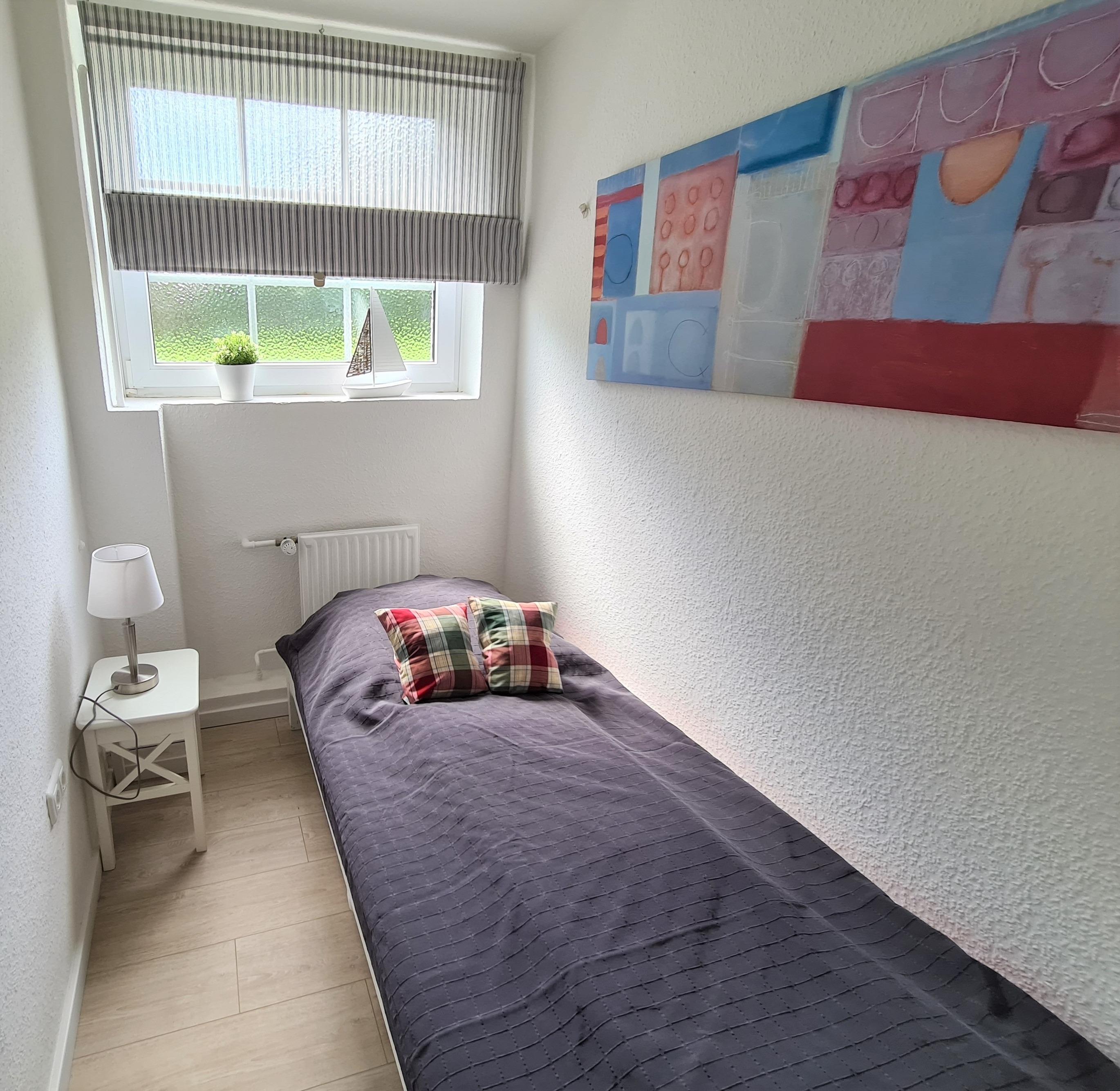 Über den Haupteingang gelangen Sie gleich unten rechts zur Unterkunft im Souterrain. Der moderne mit Laminat und Fliesen ausgelegte Boden erstreckt sich durch alle Räumlichkeiten. Das kleine Einzelzimmer mit Bett (90x200) und Nachttisch befindet sich gleich vorne links. Rechts liegt das große freundliche Schlafzimmer mit Doppelbett (140x200), Kommode, Kleiderschrank und Flachbild-TV. Von hier aus gelangen Sie in das Duschbad. Die Schlafunterkunft liegt in zentraler Lage von Grömitz. Die weitläufige Promenade mit ihren vielen kleinen und großen Geschäften, Cafés und Restaurants ist nur wenige Gehminuten entfernt.