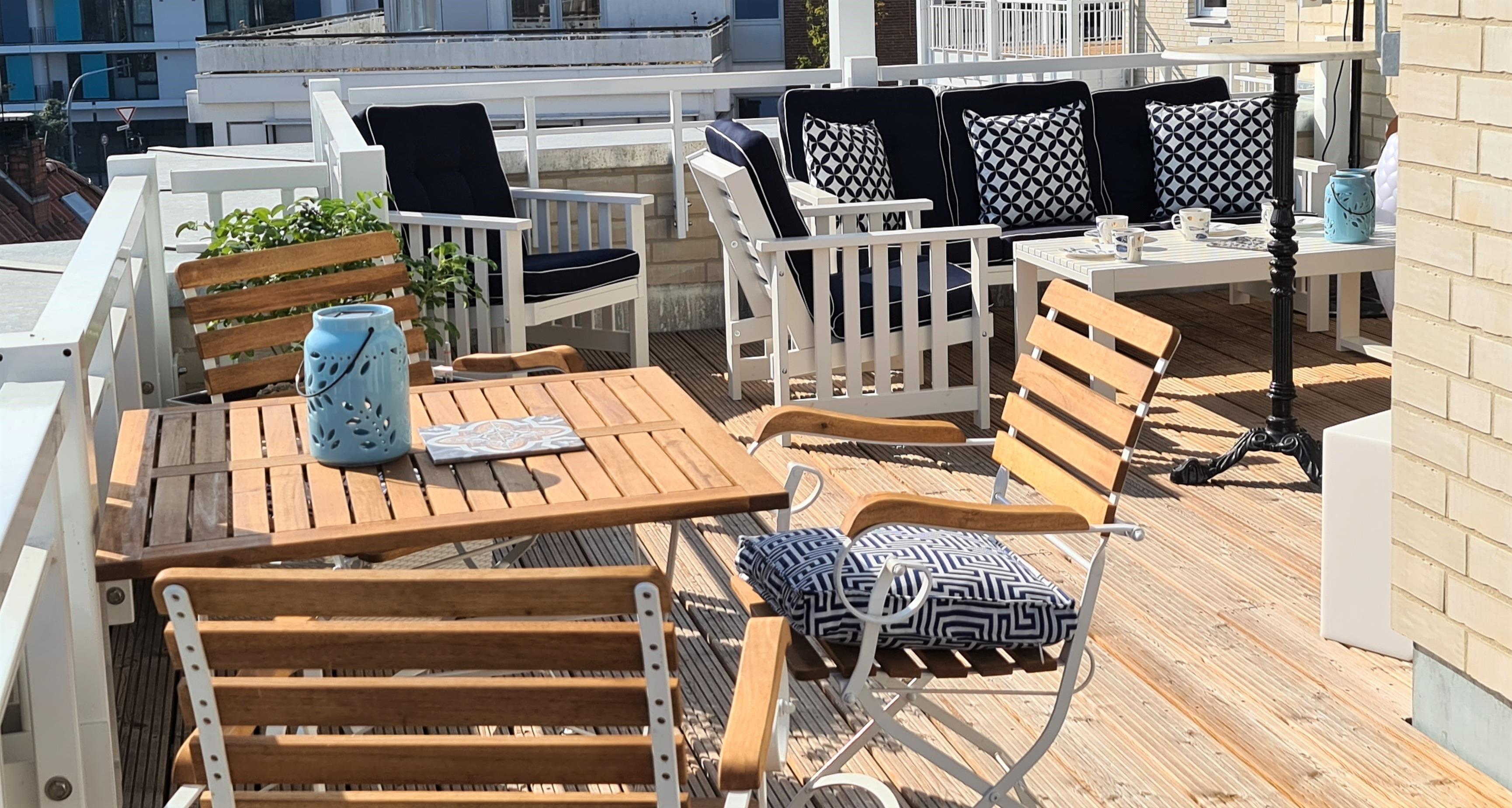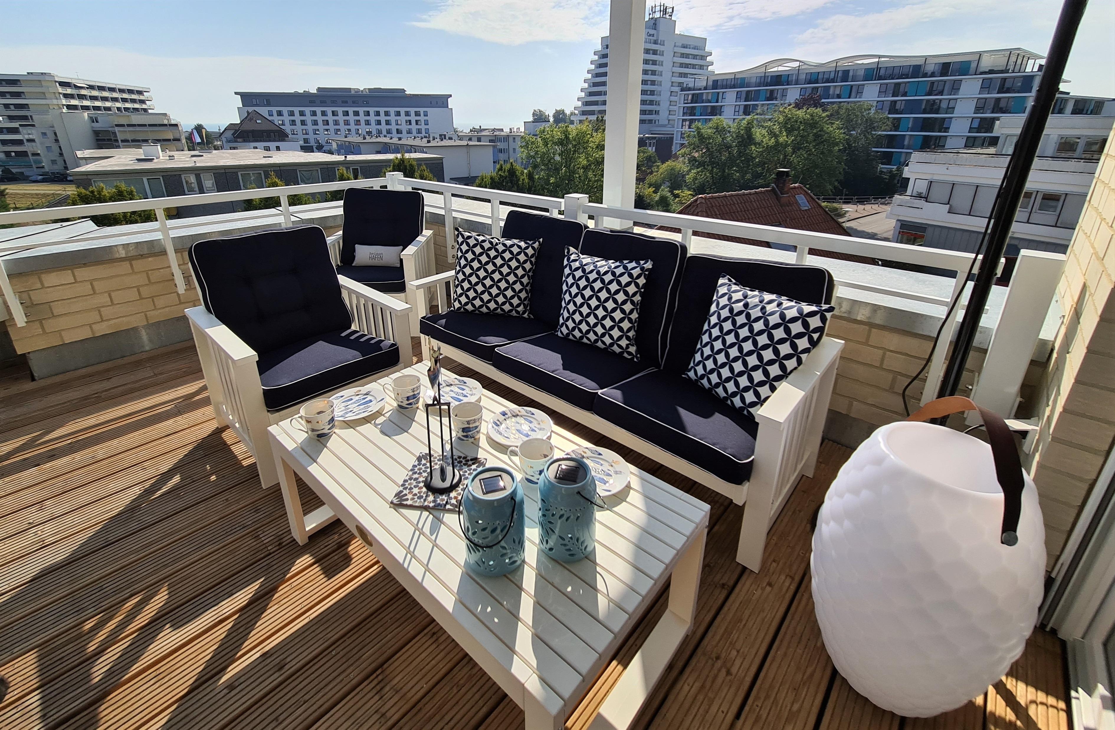 Der Balkon (6qm), die großzügige Terrasse (19qm) und die Dachterrasse (40qm), die allesamt mit hochwertigen Garten- und Loungemöbeln ausgestattet sind, machen diese Wohnung zu etwas Besonderem. Genießen Sie die Sonne und die Teilmeerblicke von früh bis spät. Ein Wärmestrahler ermöglicht Ihnen wohlige Abende auch im Herbst. Moderne LED-Lampen mit Bluetooth-Lautsprecher sorgen für Ihre Lieblingsmusik.
