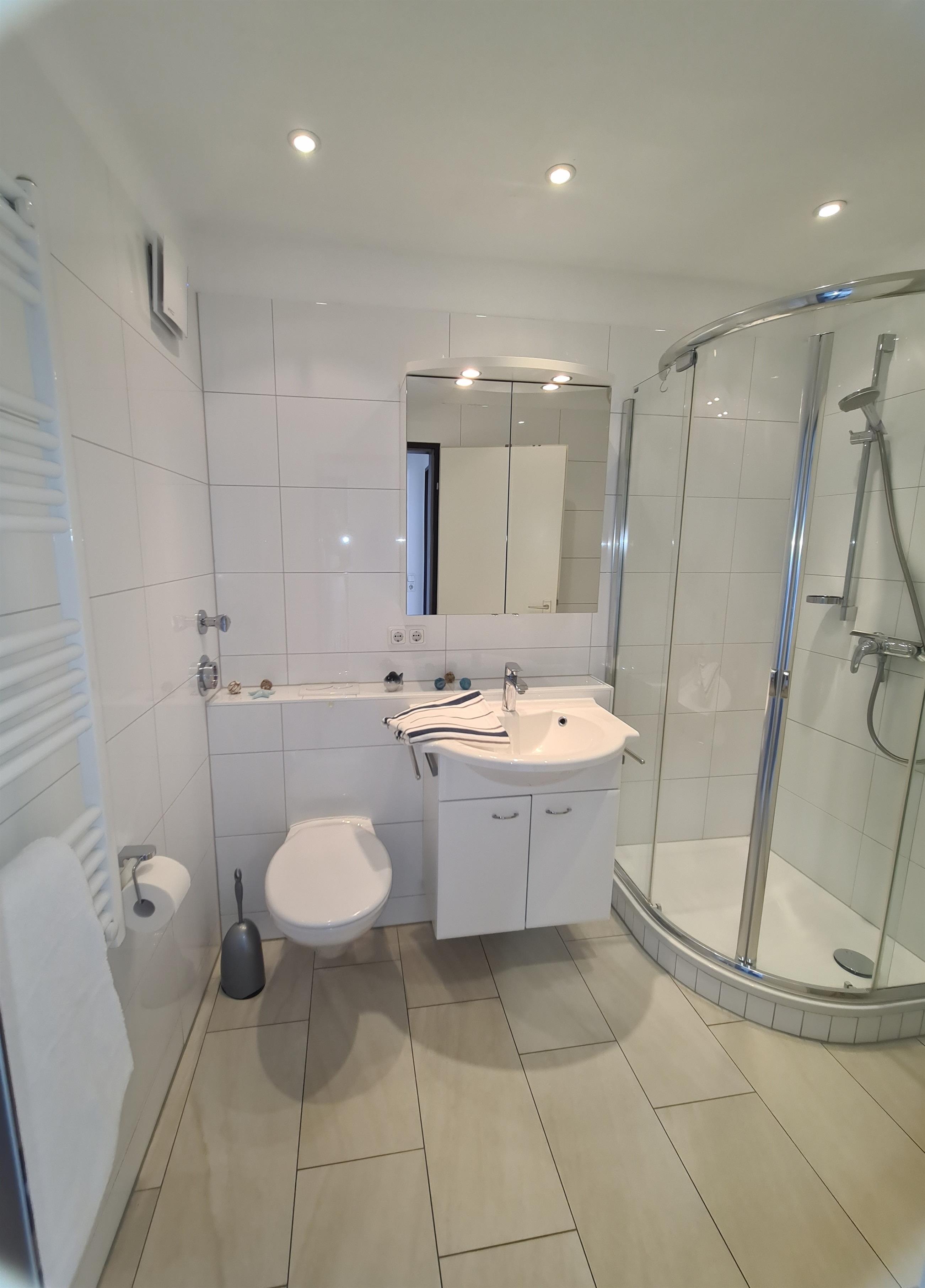 Freundliches, modern gefliestes Badezimmer mit Dusche, WC und Waschbecken.