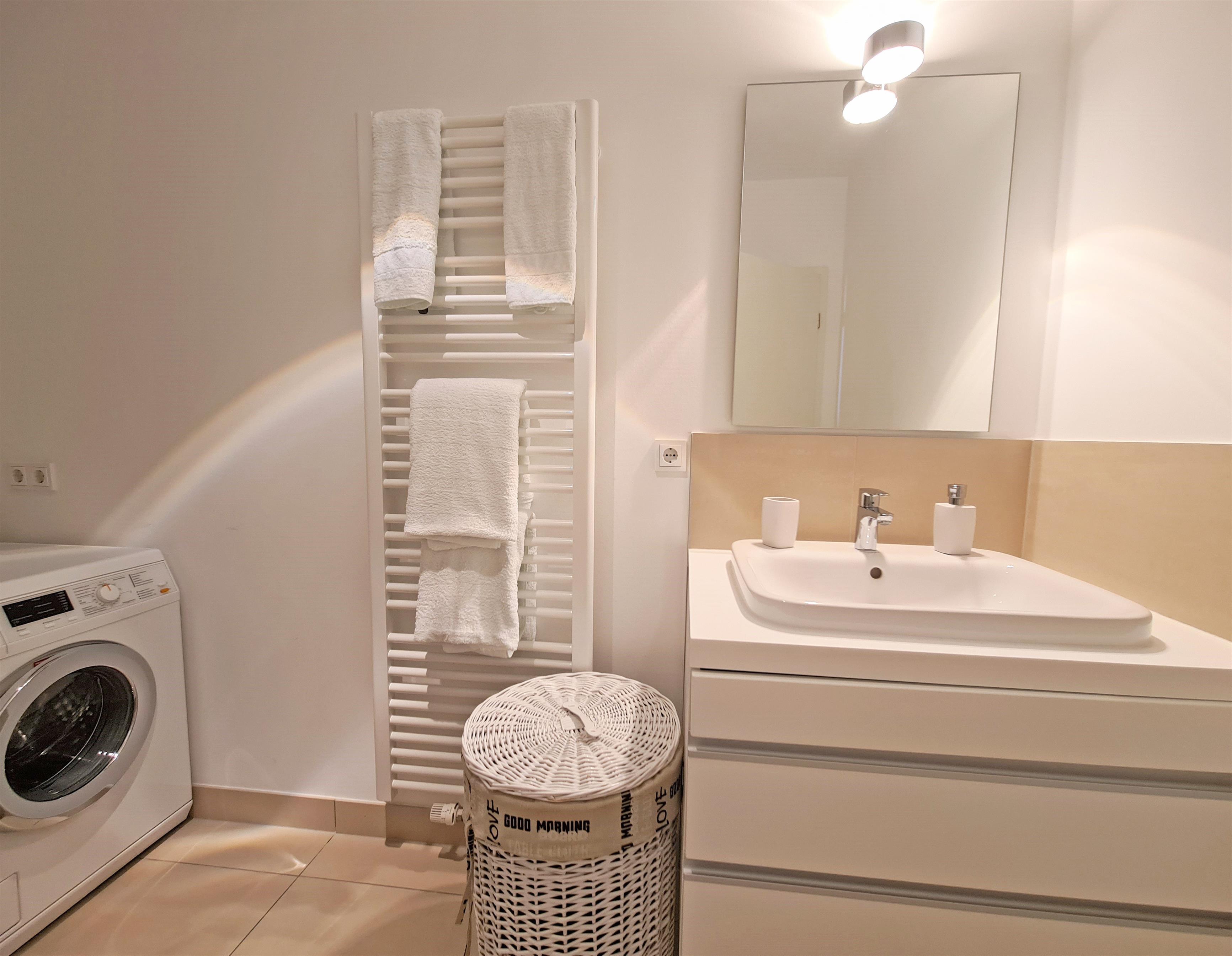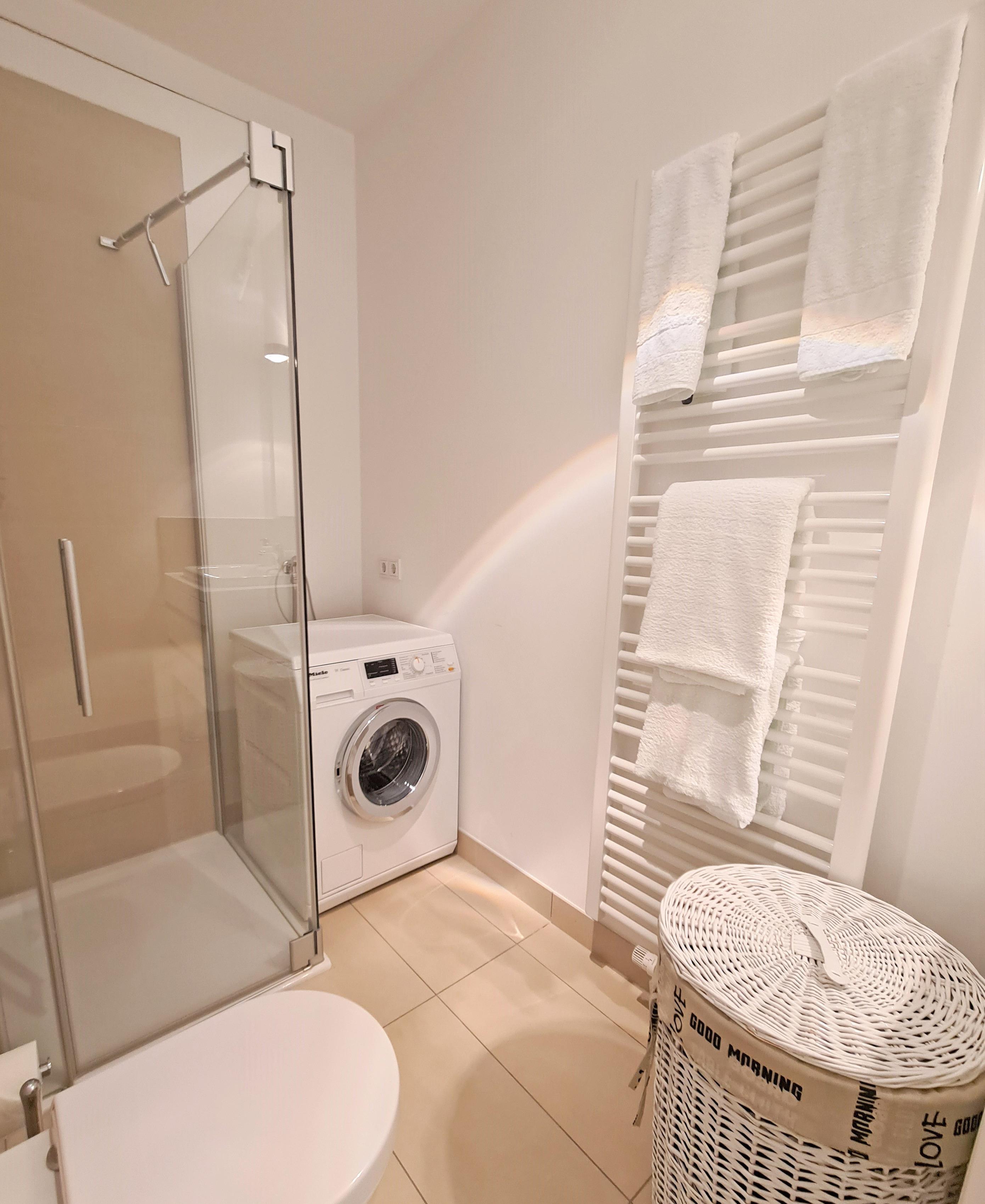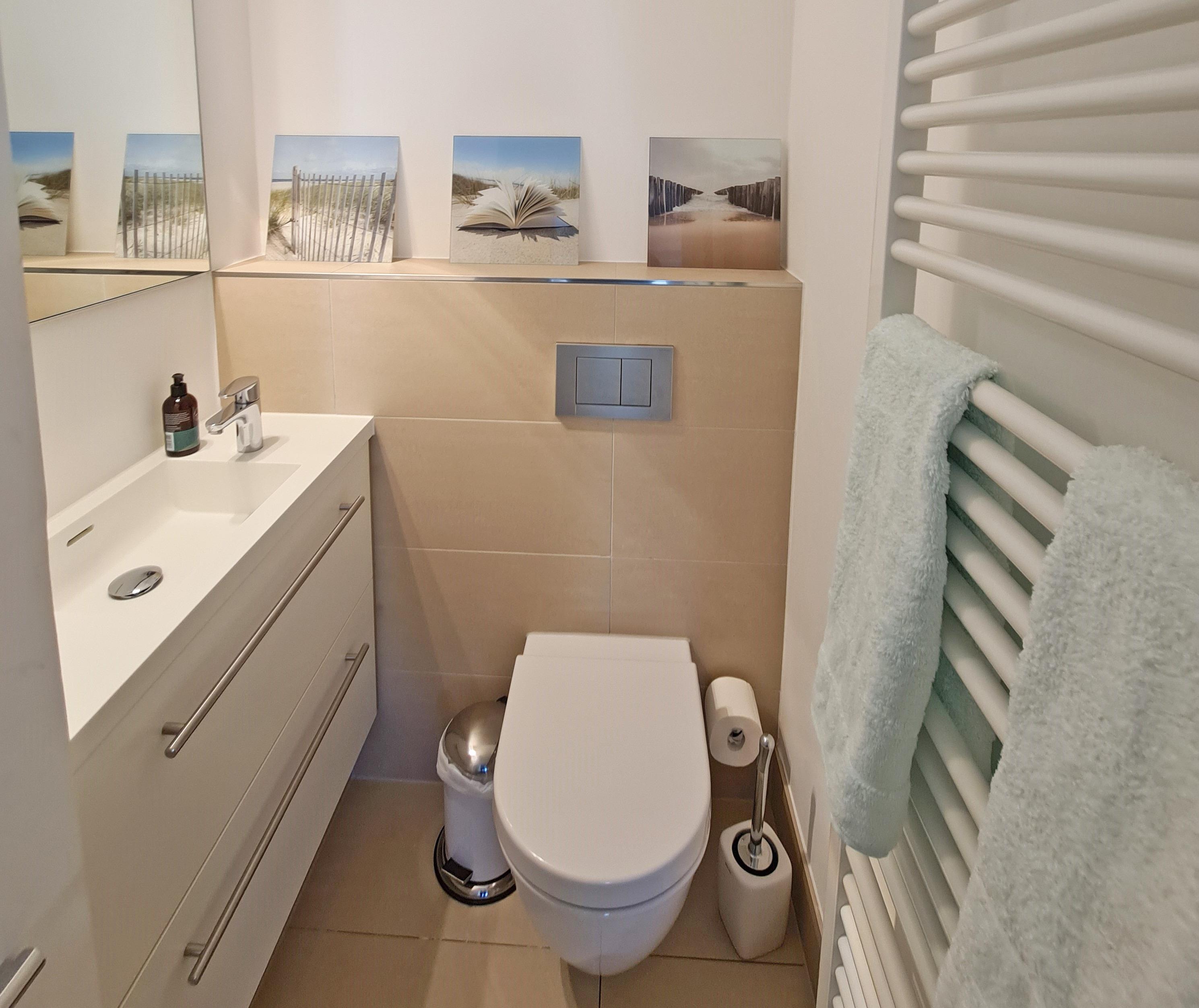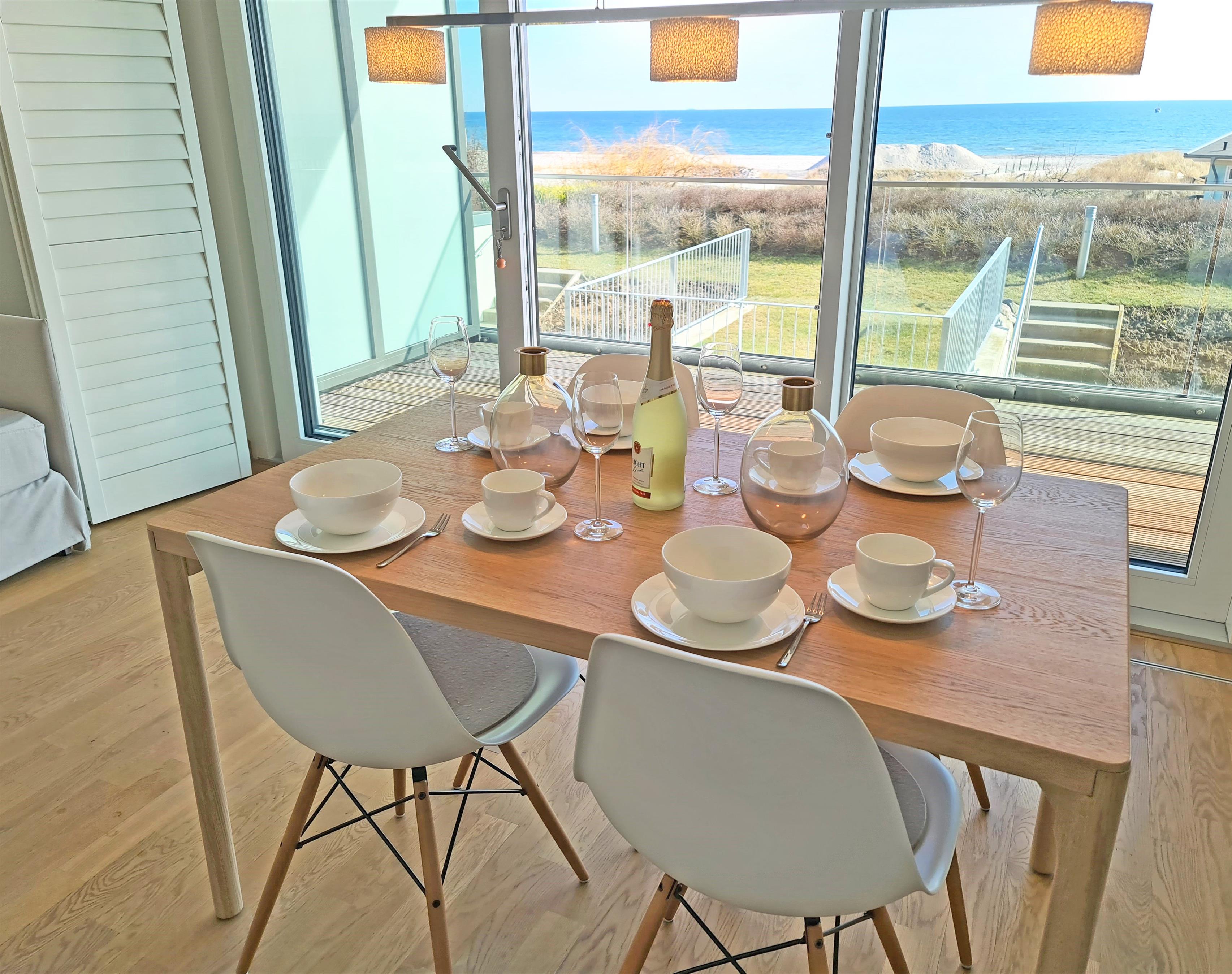 Der geschmackvolle, moderne Wohnzimmerbereich bietet Ihnen eine Schlafcouch und Sessel, sowie einen großzügigen Essbereich für bis zu 4 Personen. Von hier aus gelangen Sie auf den Balkon mit einzigartigem Blick auf die Ostsee und dem feinsandigen Strand. Die zum Wohnzimmer offene, moderne Küche ist mit Backofen, Induktionsfeld, Kühlschrank, 3*Gefrierfach, Geschirrspüler, Kaffeevollautomat, Wasserkocher und Toaster ausgestattet. Über den Flur gelangen Sie in das 1. Duschbad. Dieses ist mit einer Dusche, WC, Handtuchheizung, Haartrockner sowie einem Waschtisch ausgestattet. Außerdem verfügen Sie während Ihres Aufenthaltes über eine eigene Waschmaschine. Zum Schlafzimmer gelangen Sie über eine Wendeltreppe. Es ist ausgestattet mit einem hochwertigen Polsterdoppelbett (2x90x200), einer Kommode und einem Flachbild-TV. Angrenzend befindet sich ein Gäste-WC mit Handtuchheizung und Waschtisch. Die bodentiefen Fenster im Schlafzimmer bieten Zugang zur Terrasse.