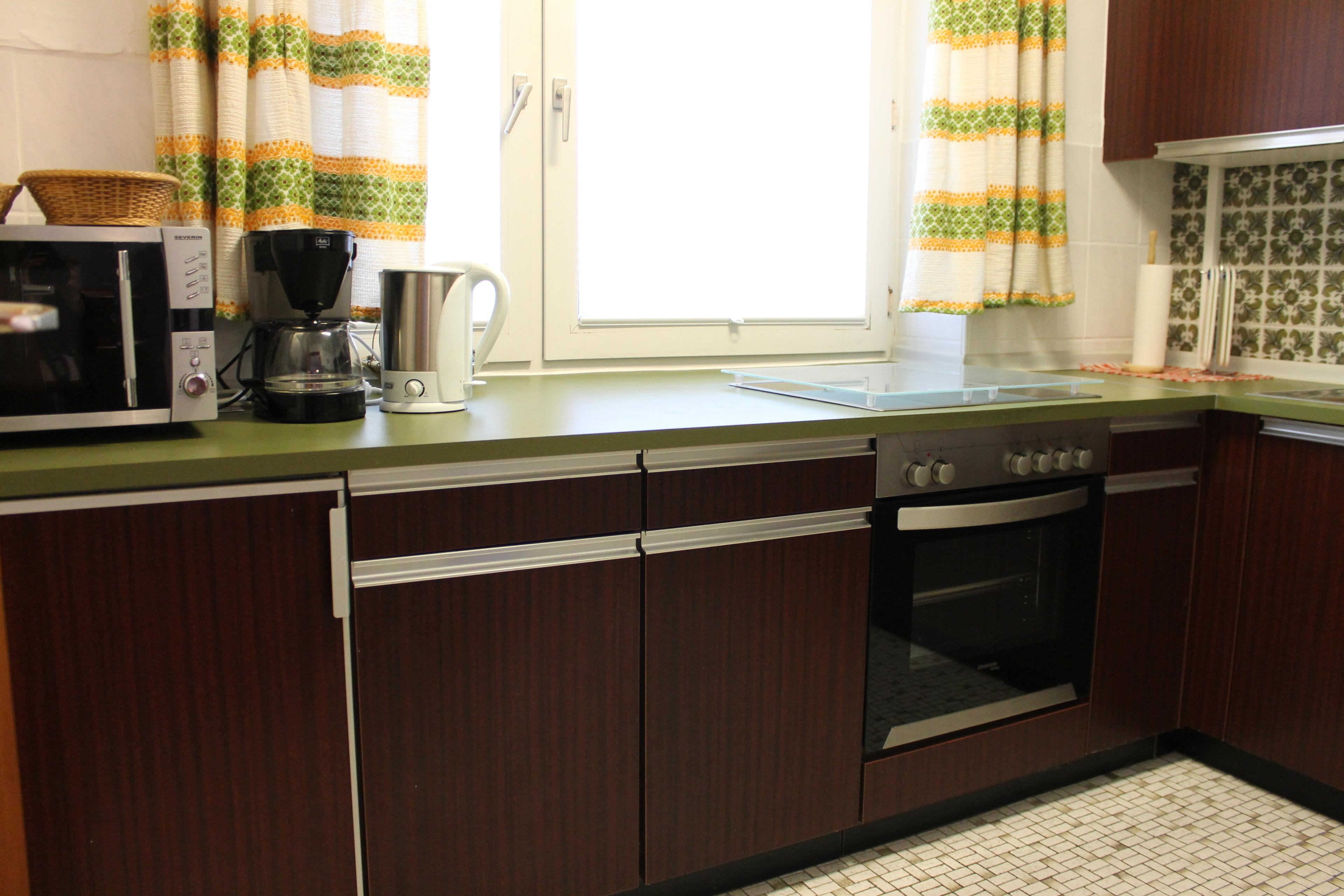 Die gut ausgestattete Küche besitzt unter anderem einen Kühlschrank, einen Herd zum Kochen, Kaffeemaschine und Toaster.