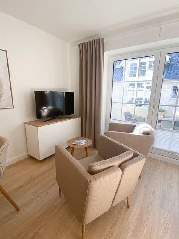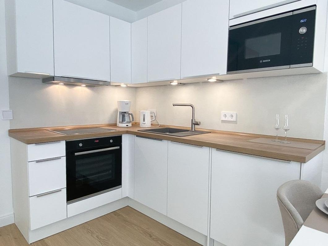 Eine wunderschöne hochmoderne Ferienwohnung in der 1.Etage eines sehr gepflegten Appartementhauses, nur ca. 250m vom weißen Ostseestrand und der schönen und beliebten Promenade entfernt. Die Wohnfläche der ca. 34qm großen Ferienwohnung verteilt sich auf einen Wohn-/Schlafraum mit integrierter offener und hochwertiger Einbauküche, über ein modernes Duschbad mit WC sowie einen möblierten Balkon in Südwestlage. Der große Wohnraum ist mit einem Doppelbett (getrennte Matratzen, offenes Fußende, Maße 2x0,90x2,00 Meter), 2 gemütlichen Sesseln, einen TV-Schrank mit TV-Flachbildfernseher, einen großen Kleiderschrank sowie einer offenen Küchenzeile mit Essplatz versehen. Die Küche ist u.a. mit 4 Cerankochfeldern mit Dunstabzugshaube, Mikrowelle, Geschirrspülmaschine, Kühlschrank mit Tiefkühlfach, Kaffeemaschine, Toaster und Wasserkocher ausgestattet. Von hier aus haben Sie Zugang zu dem möblierten Südwest-Balkon, der überdacht ist und sich auch bei schlechtem Wetter genießen lässt. Das Badezimmer verfügt über ein WC, Dusche und einen Waschtischschrank mit viel Stauraum. Die Ferienwohnung wurde umfassend renoviert, liebevoll eingerichtet und befindet sich in ruhiger Lage am Blankwasserweg, der parallel zum Deich mit dem dahinerliegendem Strand verläuft. Zusätzlich steht ein kostenfreier Parkplatz sowie ein überdachter Fahrradabstellplatz auf dem Grundstück für Sie bereit.