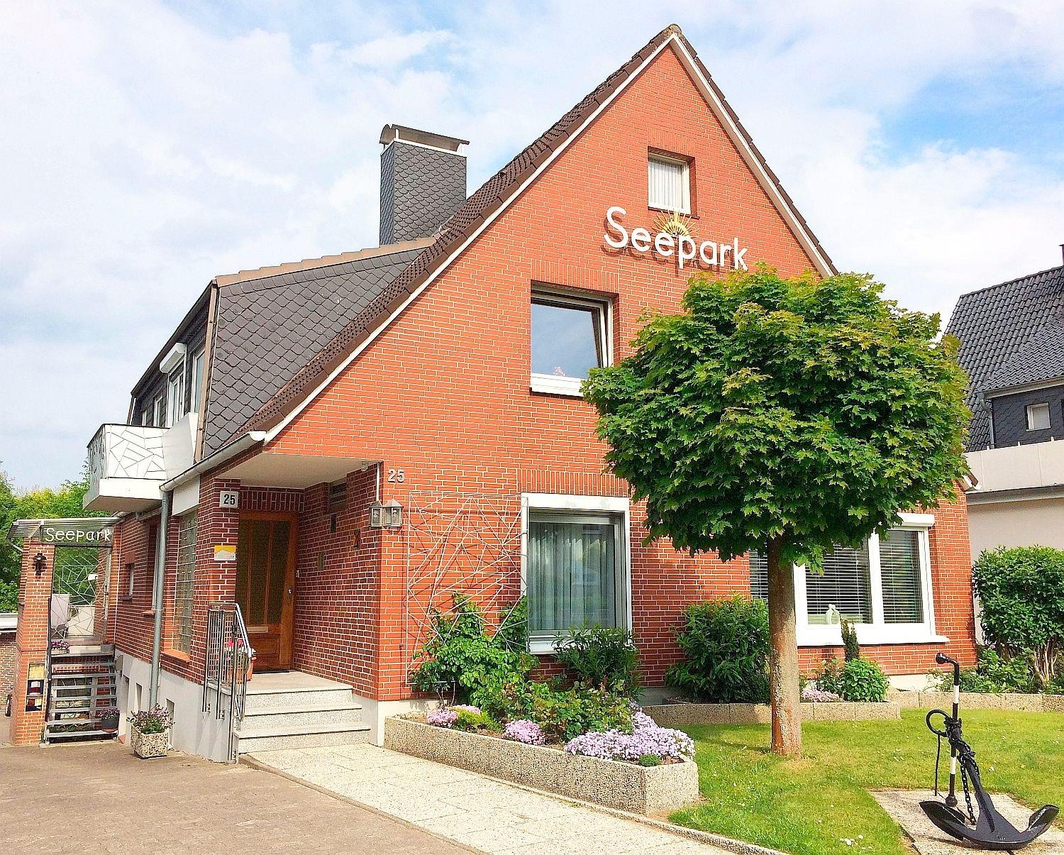 Der Seepark ist in leichter Hanglage zwischen der Christian-Westphal-Straße und dem Kurpark eingebettet. Die Wohnung Steuerbord erreichen Sie durch den ebenerdigen Eingang auf der Garten- und Kurparkseite des Hauses.