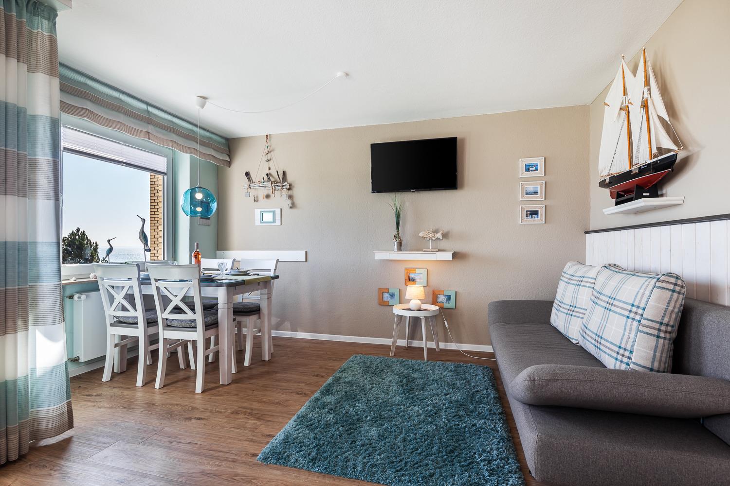 Die Wohnung , welche sich in der 3. Etage befindet, erreichen Sie bequem mit dem vorhandenen Aufzug. Die geräumige Wohnung ist großzügig eingerichtet. Auch bei schlechtem Wetter fühlt man sich nicht beengt. Hierfür sorgen LCD-TV in 2 separaten Zimmern und die unterschiedlichen Sitzgelegenheiten. Der kombinierte Wohn-/Essbereich ist 28 qm und das separate Schlafzimmer 10qm groß. Das Bett ist mit einem hochwertigen und durchgehenden Topper (160x200) ausgestattet. Beide Zimmer verfügen über eigene Balkone in direkter Meeresausrichtung. Im morgendlichen Trubel ist es angenehm, dass sich Bad und WC in getrennten Räumen befinden. Die kleine, separate Küche ist mit allem eingerichtet, was den Alltag leichter macht: Cerankochfeld, Backofen, Geschirrspüler, Mikrowelle, Kühlgefrierkombi, Kaffeemaschine, Wasserkocher, Toaster.