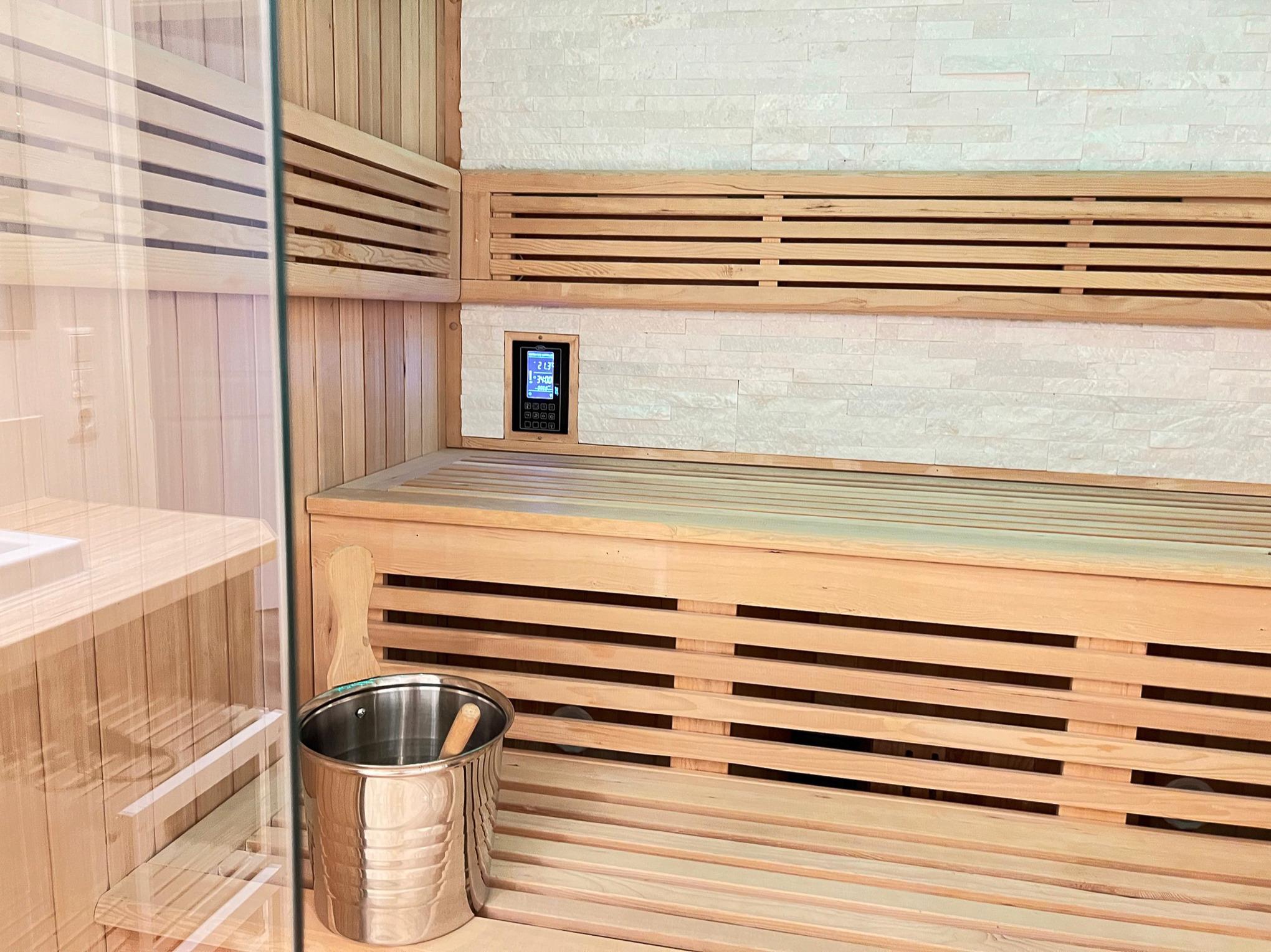 Das Badezimmer liegt zwischen den beiden Schlafräumen. Es ist eingerichtet mit einer ebenerdigen Wellnessdusche und einer Sauna. Eine Waschmaschine ist ebenfalls vorhanden.