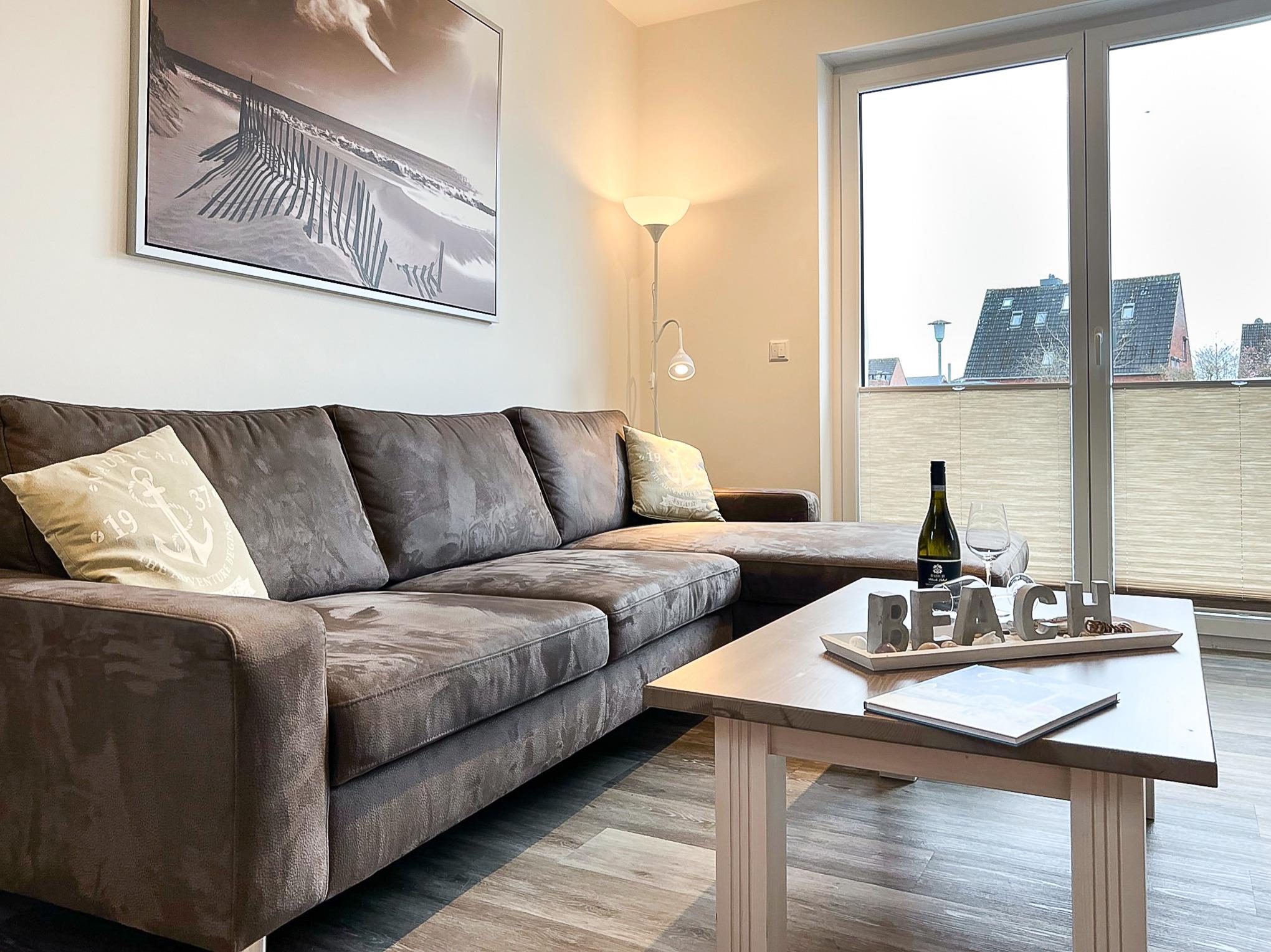 Vom Flur aus gelangt man in das sonnig-helle Wohn- und Esszimmer (mit Flachbild-TV, Hifi-Anlage und kostenlosem Internetzugang). Der komfortable Wohnbereich ist mit hellen modernen Möbeln ausgestattet. Von dort aus gelangt man auf die großzügige Süd-Terrasse (2 Wellnessliegen, Terrassenmöbel, Sonnenschirm).
