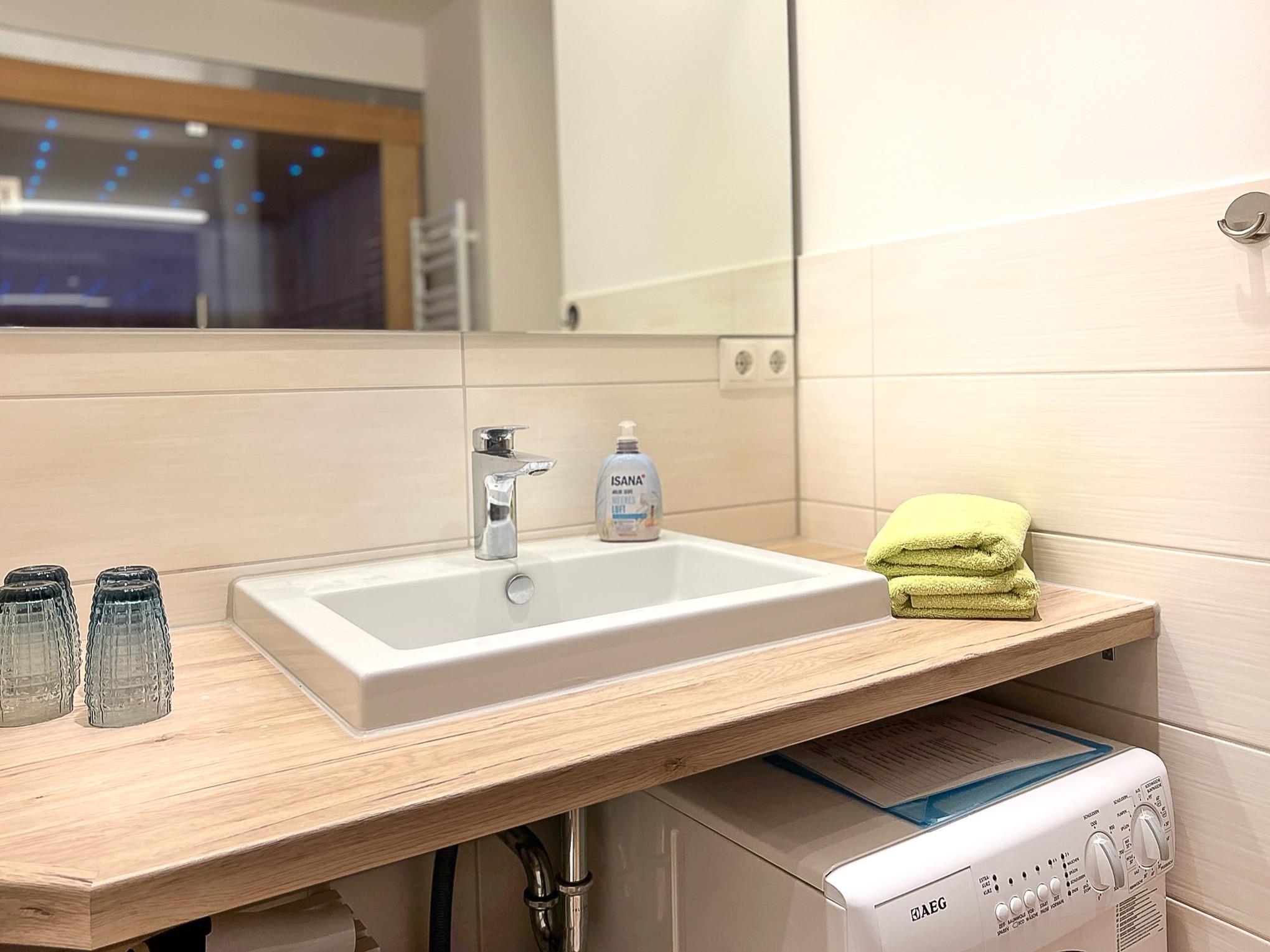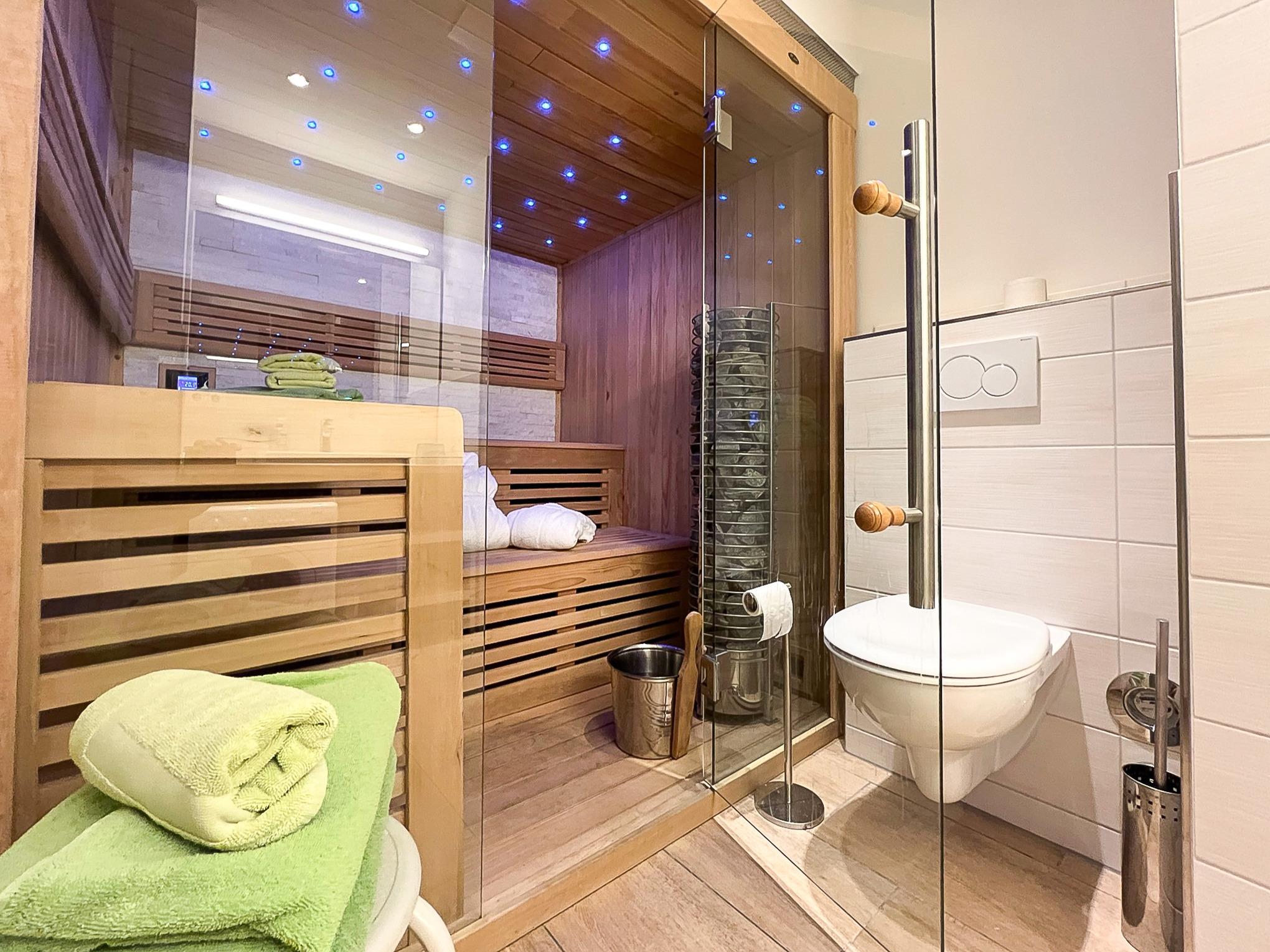 Das Badezimmer liegt zwischen den beiden Schlafräumen. Es ist eingerichtet mit einer ebenerdigen Wellnessdusche und einer Sauna. Eine Waschmaschine ist ebenfalls vorhanden.