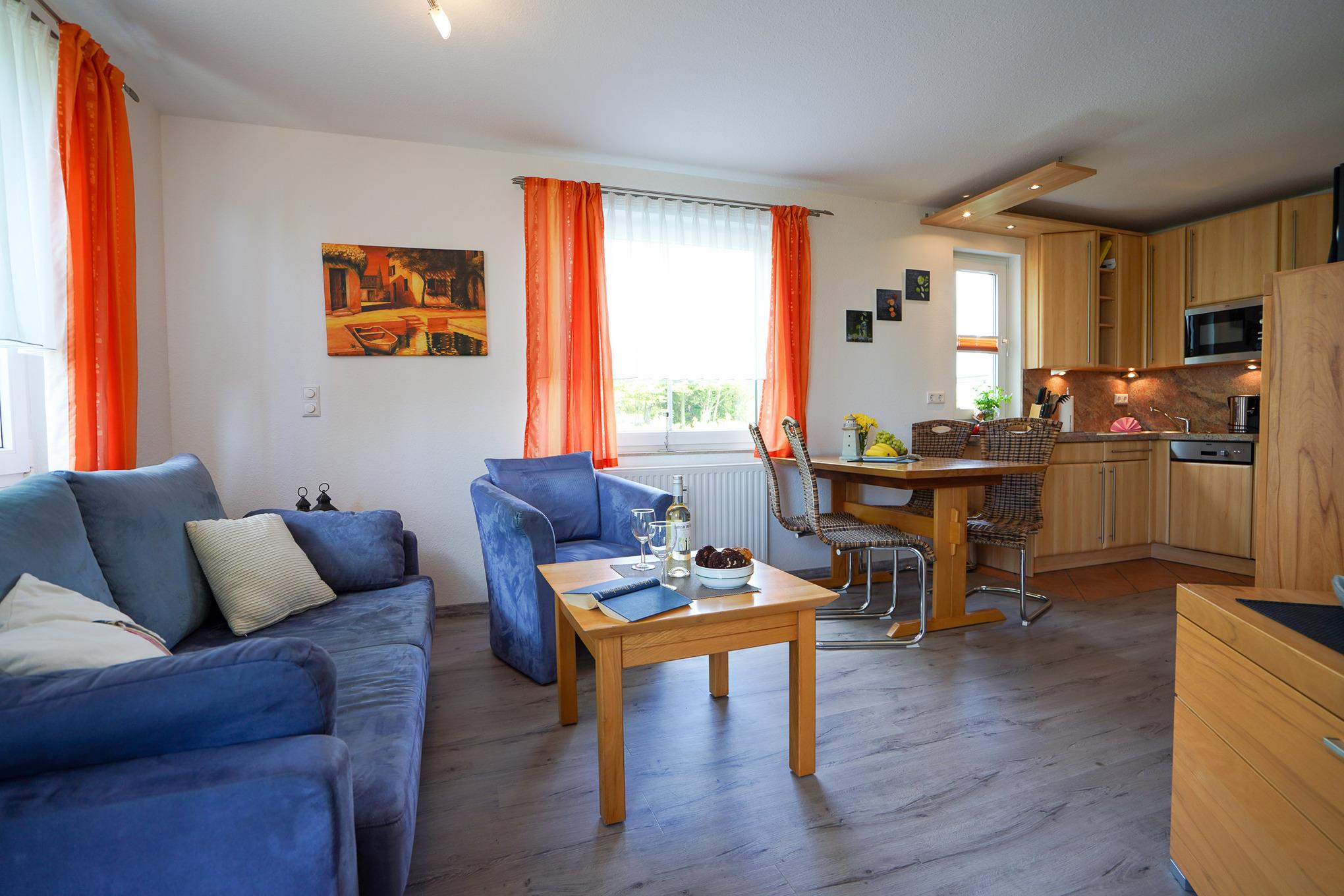Der lichtdurchflutete und geschmackvoll eingerichtete Wohn-/ Essbereich überzeugt mit Balkonzugang, Flat Screen-TV, Schlafsofa, Schränken und einem Esstisch mit Platz für 5 Personen. Der Bereich ist mit einem ansprechenden Vinylboden ausgelegt. Alle Fenster lassen sich durch Plissees verdunkeln.