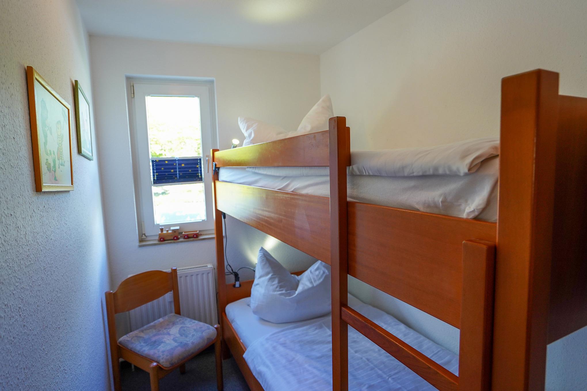 Im kleinen, separaten Kinderzimmer gibt es ein Etagenbett (je 90 x 200 cm Matratzen). Dieses Zimmer verfügt über ein Fenster und ist mit Teppichboden ausgelegt.