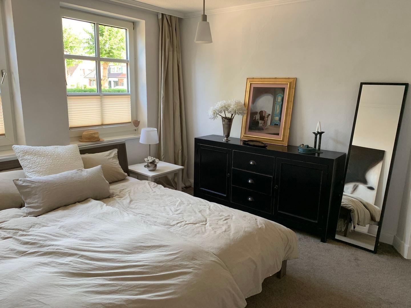 OG: Im 1. Schlafzimmer steht ein Doppelbett bereit, außerdem befindet sich dort ein geräumiger begehbarer Kleiderschrank.