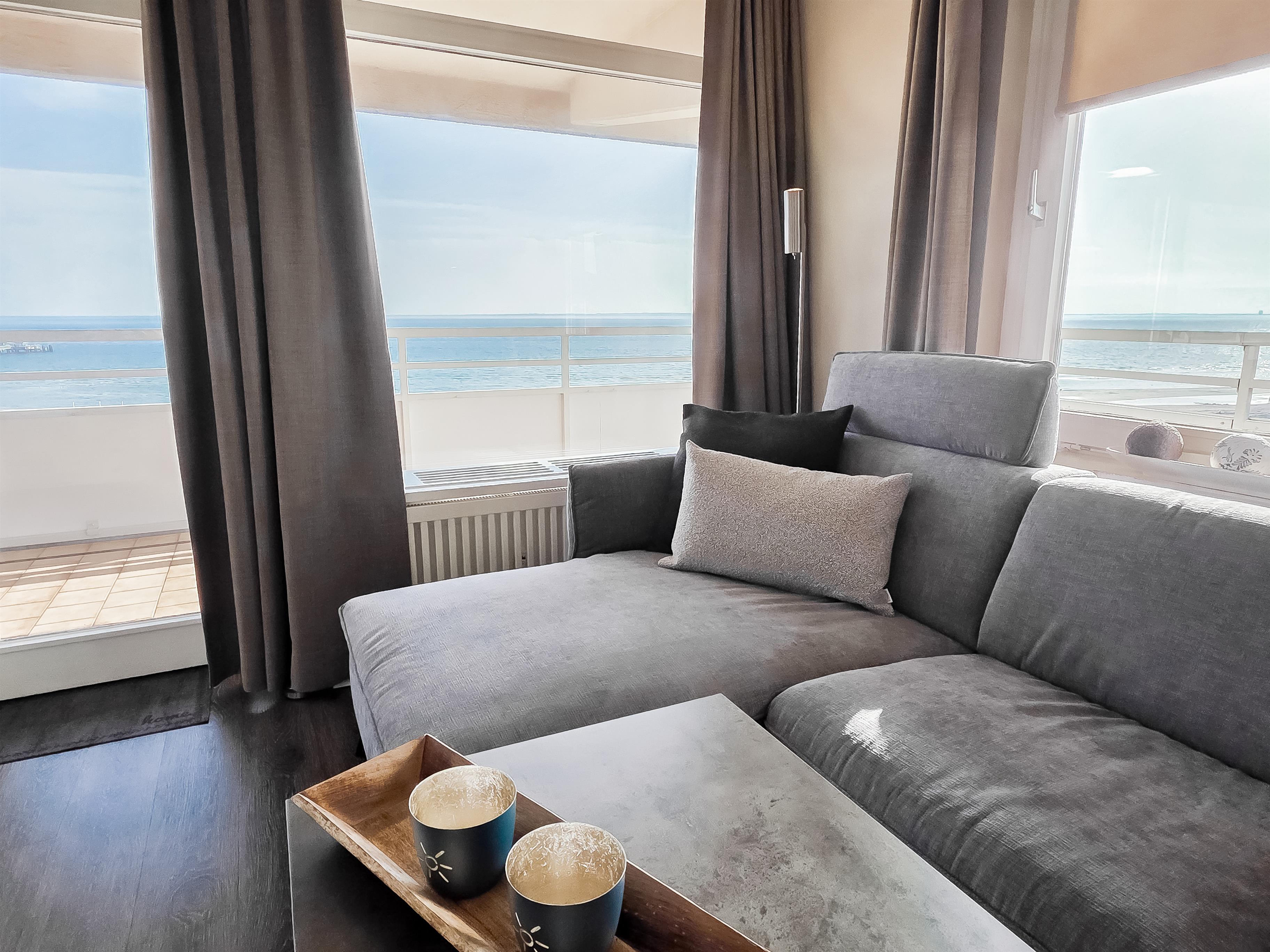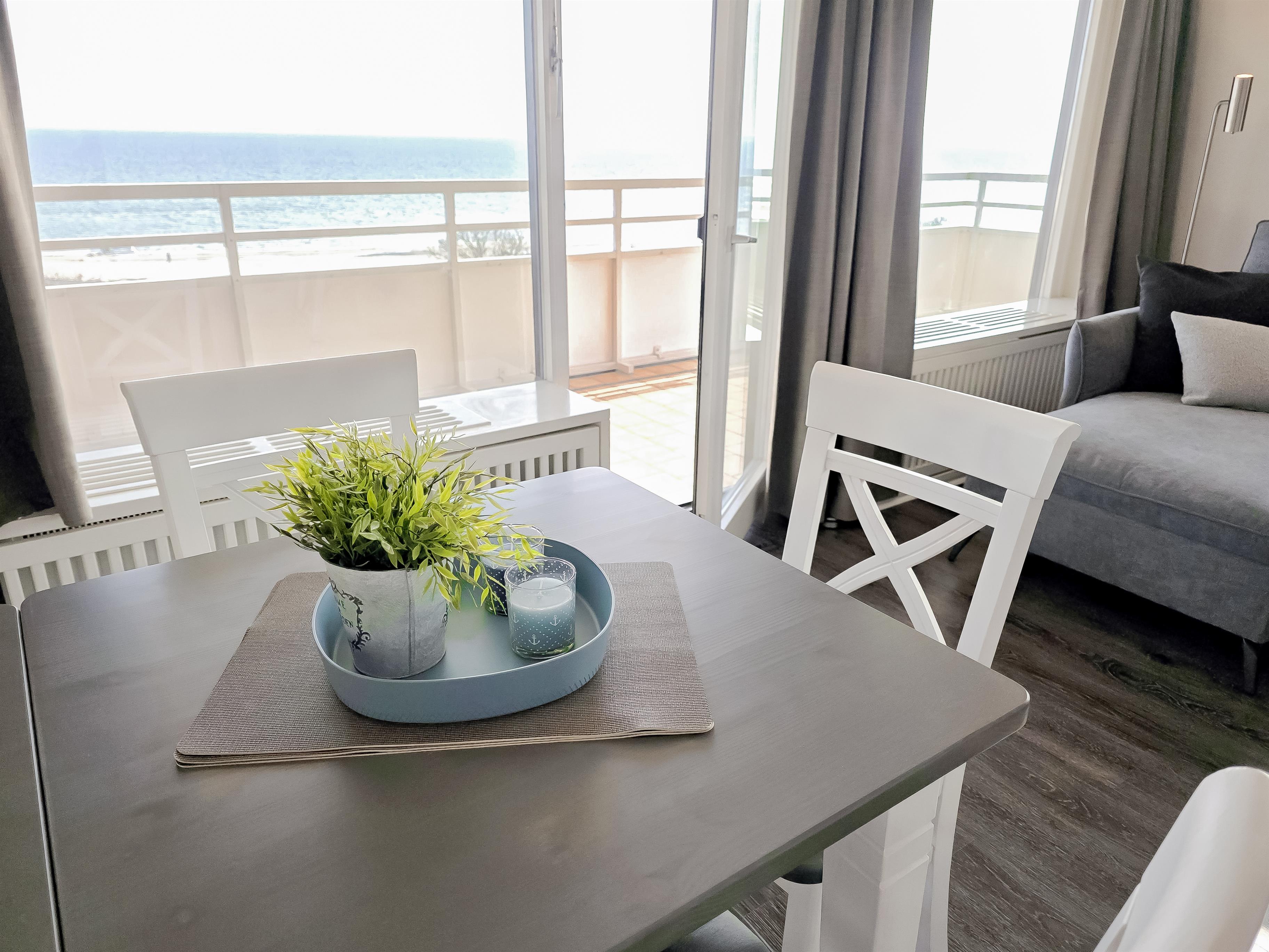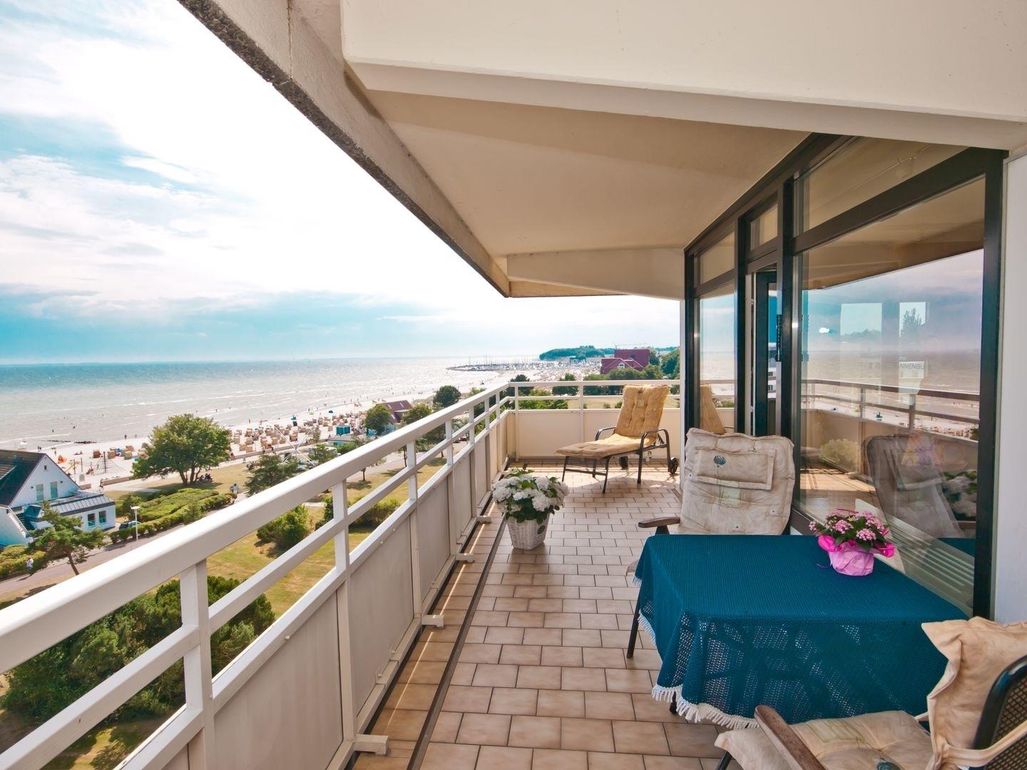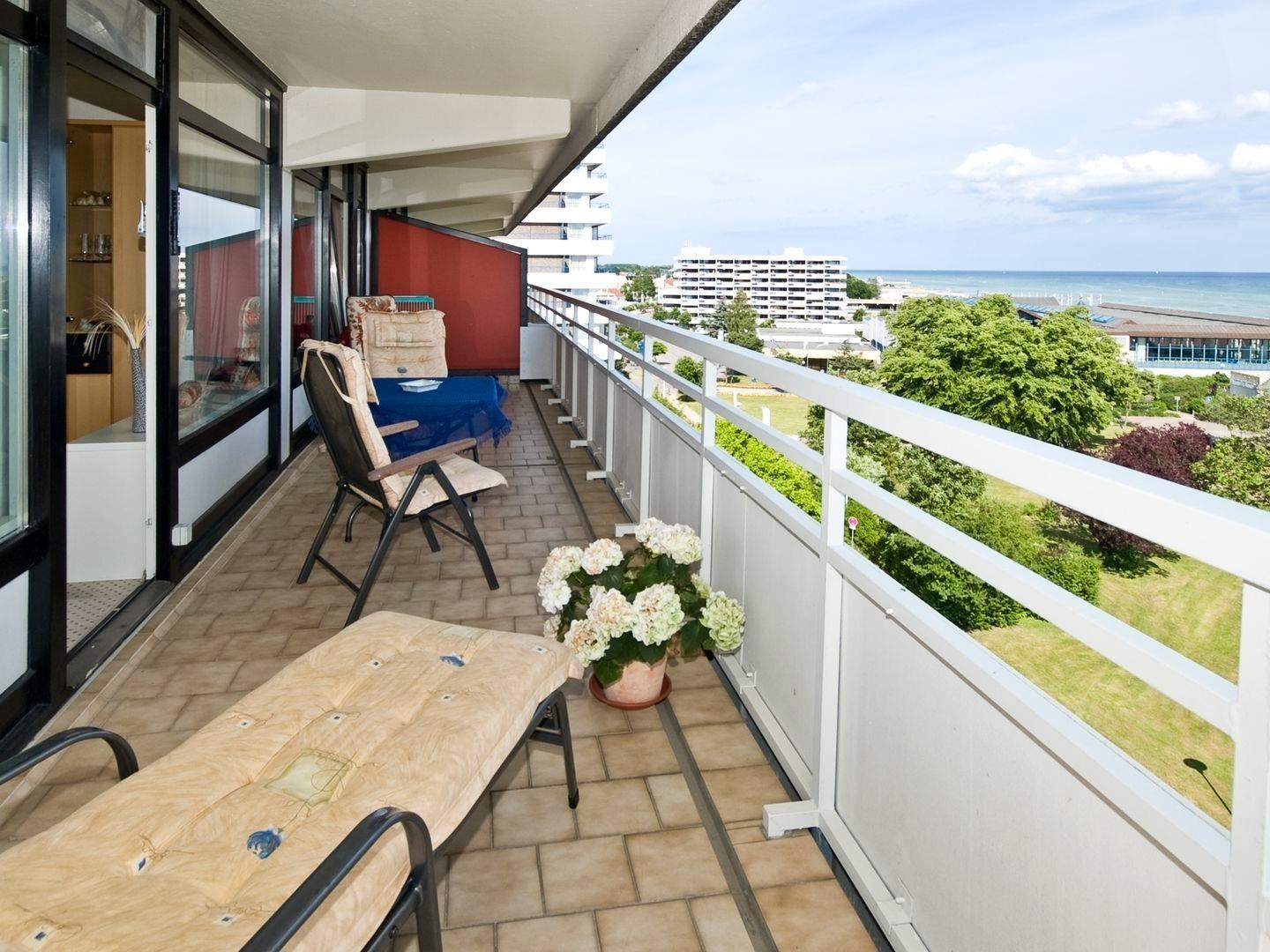 Moderne Ferienwohnung in Grömitz mit Meerblick und großem Eckbalkon, ideal für entspannte Tage an der Ostsee.