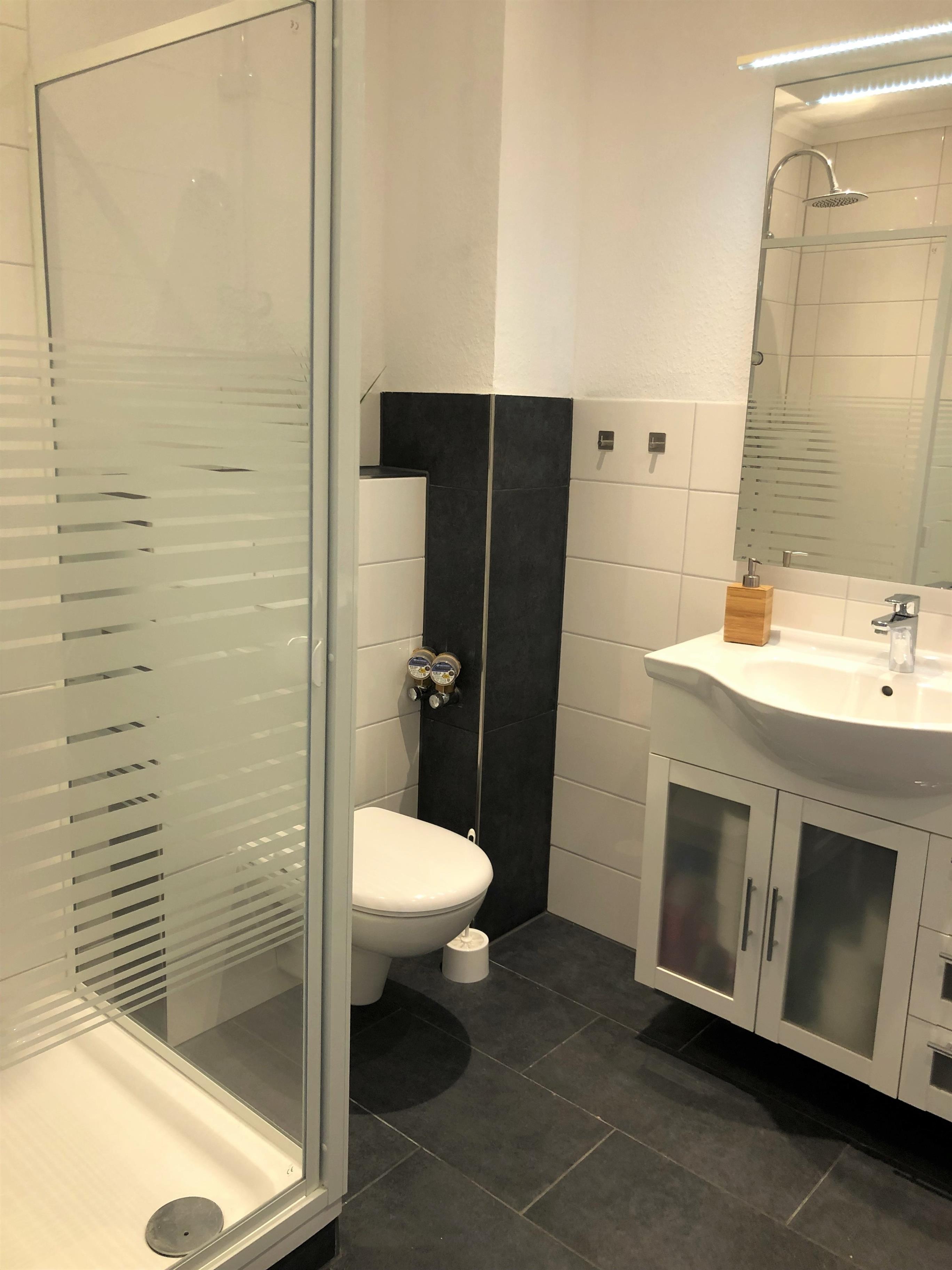 Das sanierte Badzimmer überzeugt mit hellen Fliesen, WC und Waschtisch. Es ist elegant und modern gestaltet.