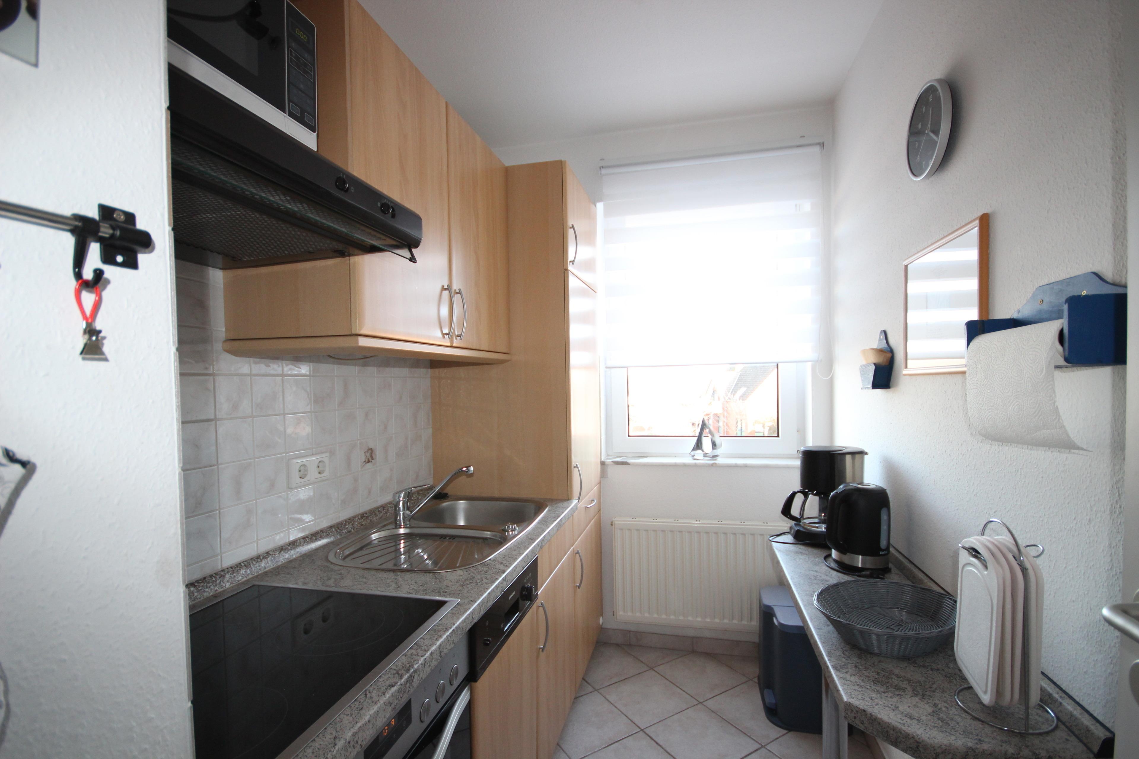 Die separate, offene Küche ist mit Backofen, 4-Platten Kochfeld, Geschirrspüler, Mikrowelle, Kühlschrank und allen üblichen Küchengeräten sehr gut ausgestattet.