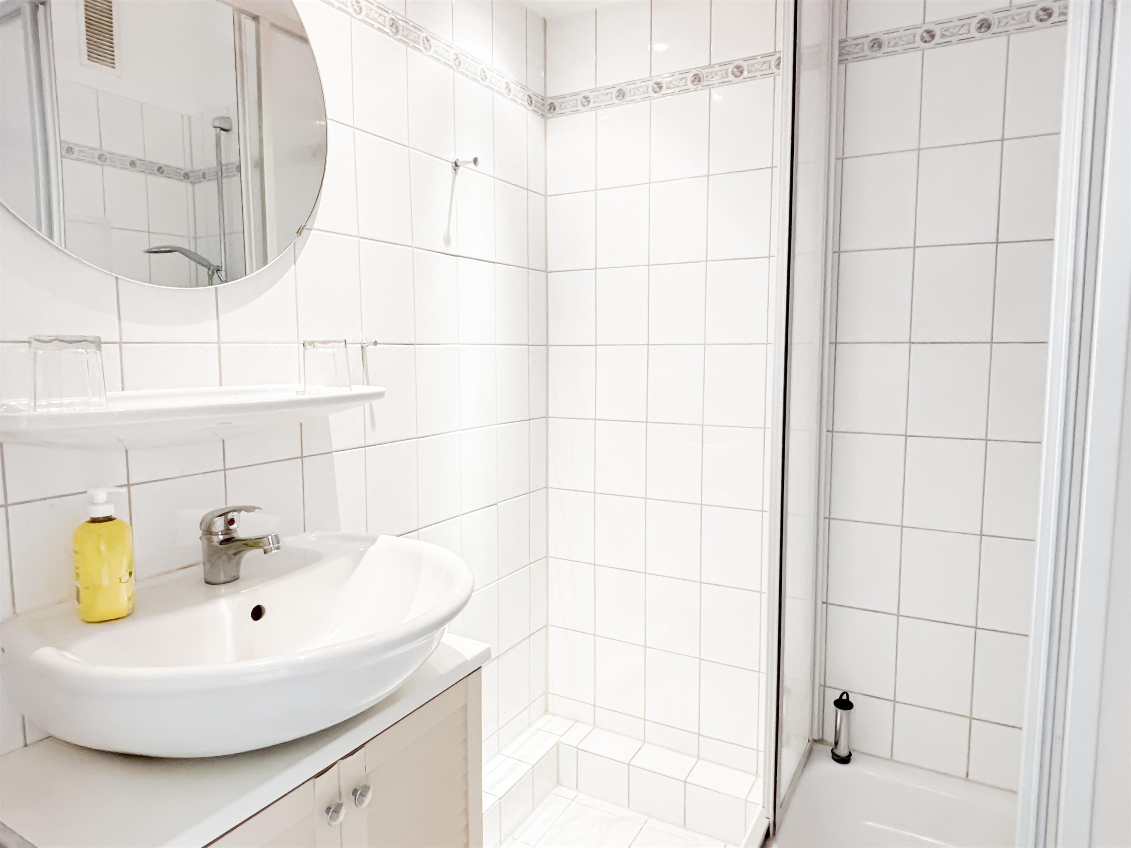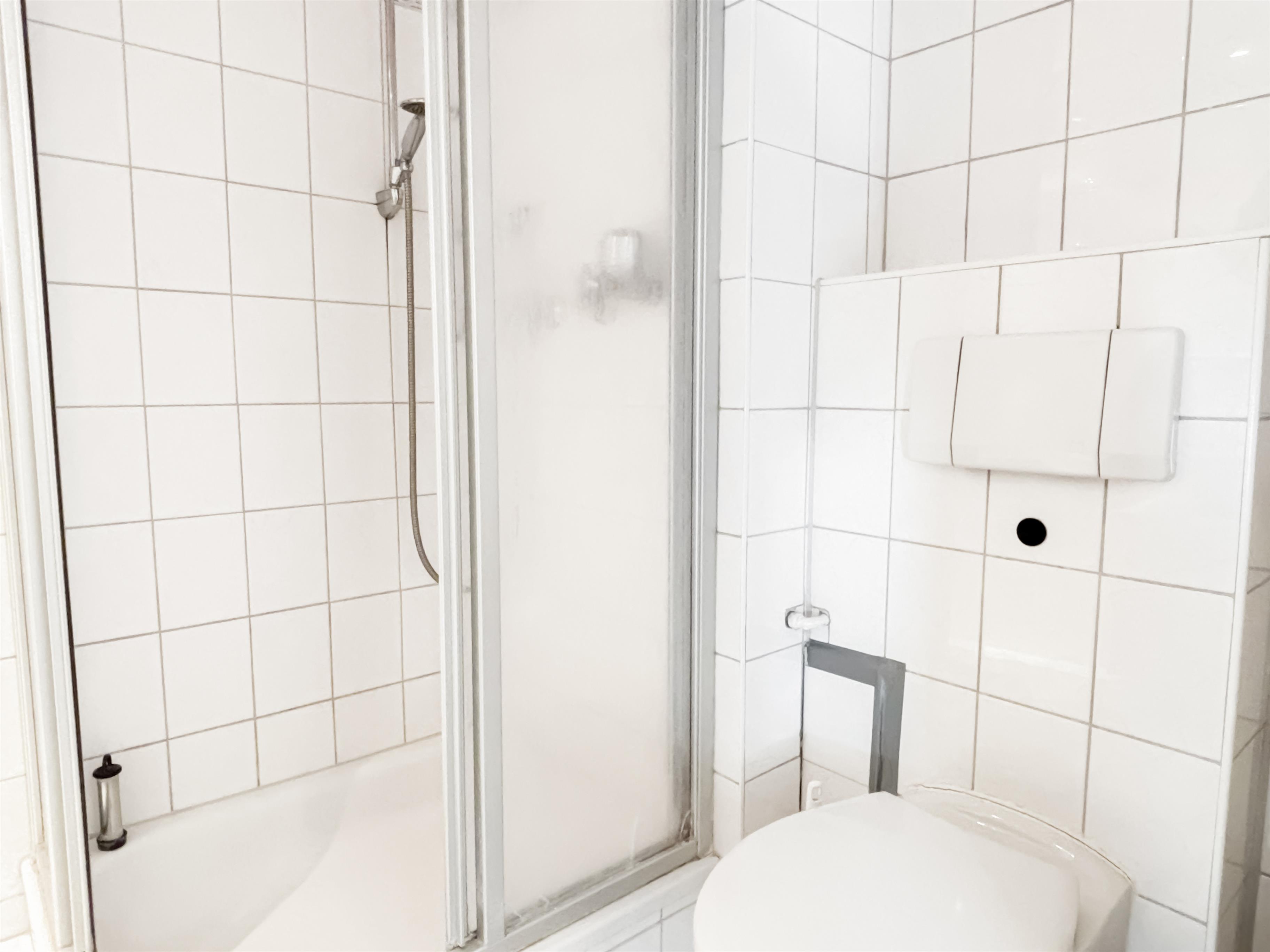 Hell gefliestes Bad mit Dusche + Trennwand, WC und Waschbecken.