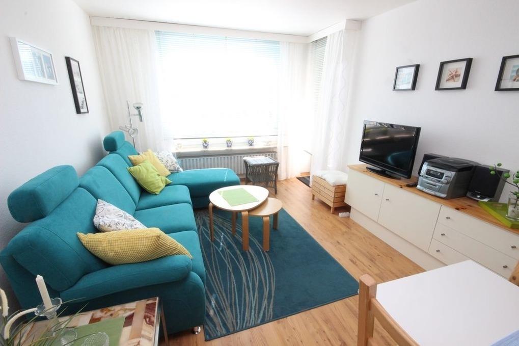 Auf ca. 44 m² bietet diese geschmackvolle, moderne Ferienwohnung ein gemütliches Wohnzimmer mit Doppelschlafsofa, Esstisch, TV und Radio. Von hier haben Sie Zugang zum sonnigen möblierten Süd-Balkon. WLAN vorhanden.