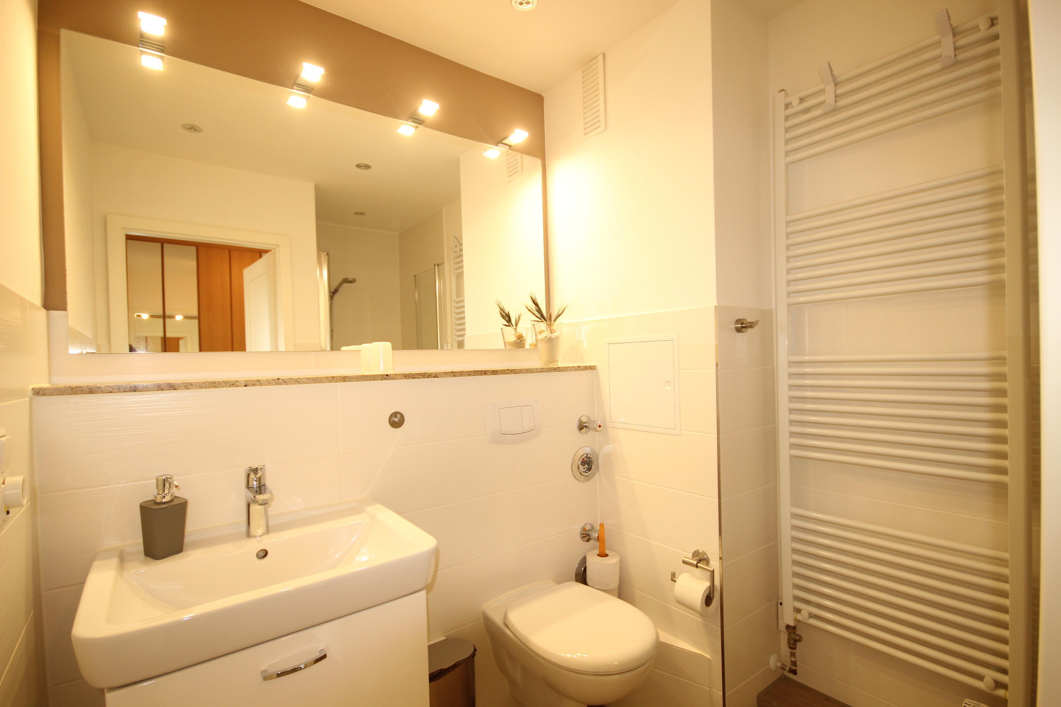 Hell gefliestes, modernes Bad mit Duschkabine, WC, Waschbecken, Handtuchheizkörper und Föhn.