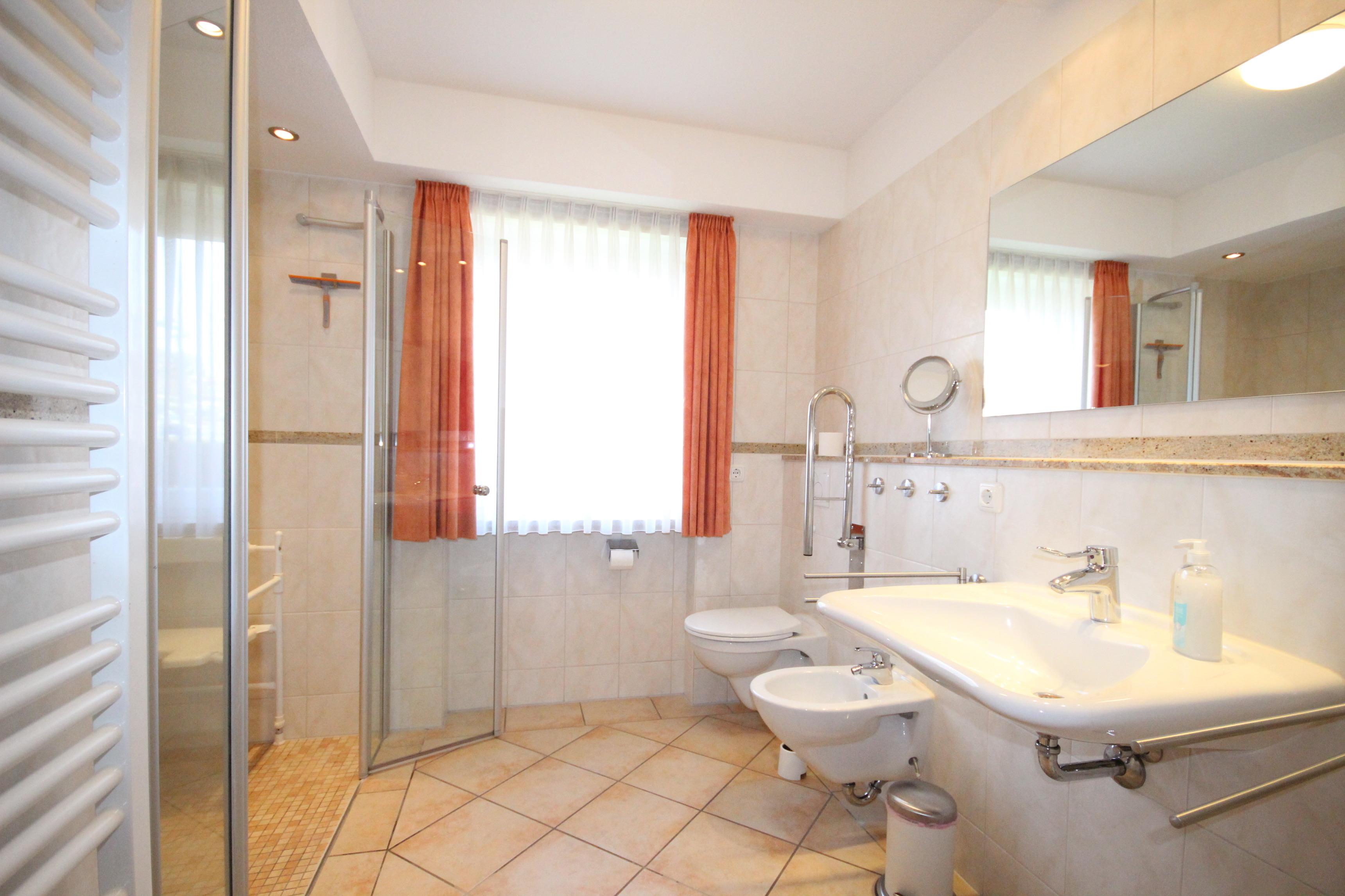 Ein barrierefreies Bad mit großzügiger Dusche, WC, Waschtisch und Bidet.