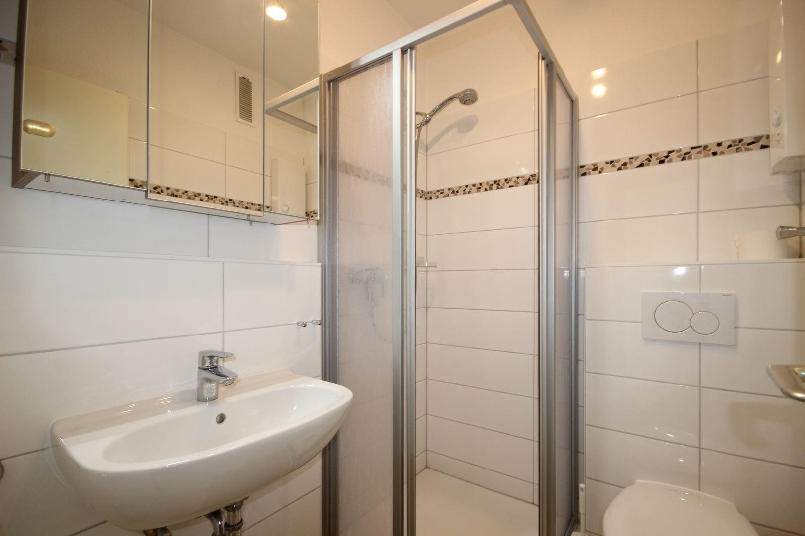 Das hell geflieste, moderne Bad umfasst eine Dusche/Trennwand, WC & Waschbecken.