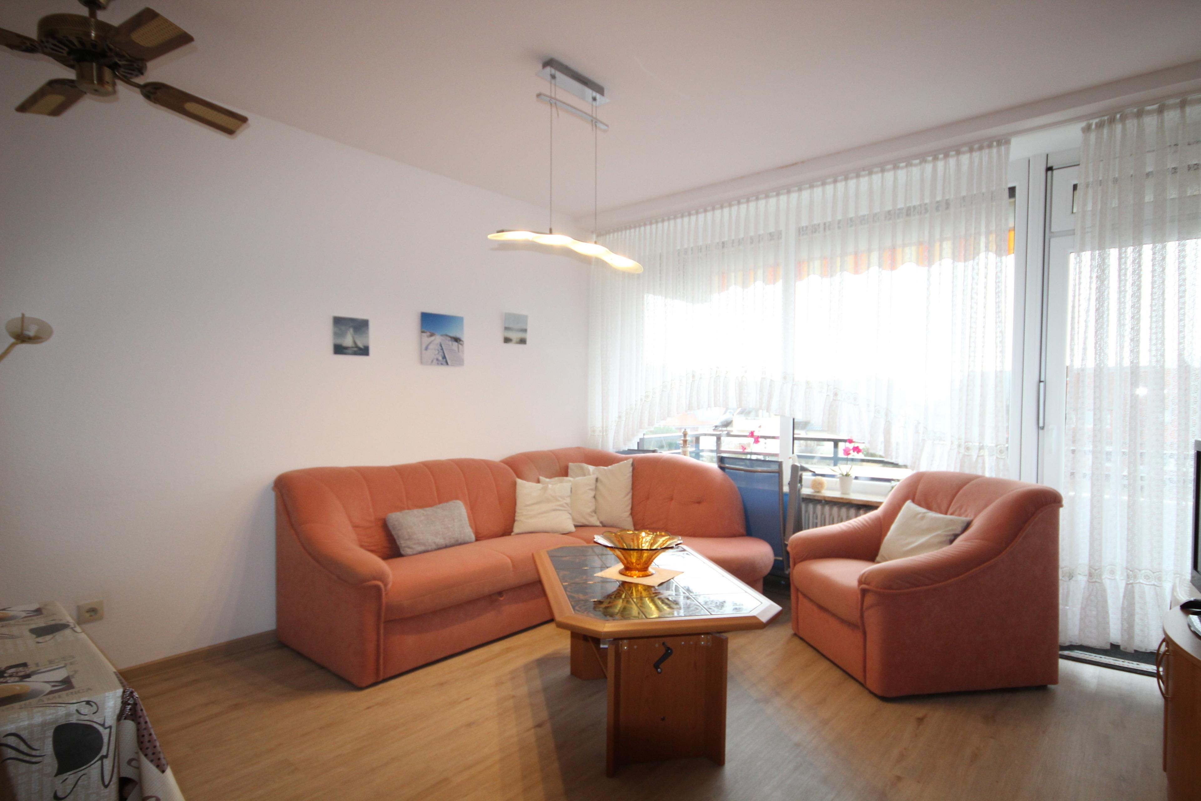 Im komfortabel eingerichteten Wohnzimmer befindet sich ein franz. Wandklappbett für 2 Personen (ca.140 x 200), TV, Radio, Essplatz für 4 Personen, bequeme Couchgarnitur sowie der Zugang zum möblierten, sonnigen Süd-Balkon.
