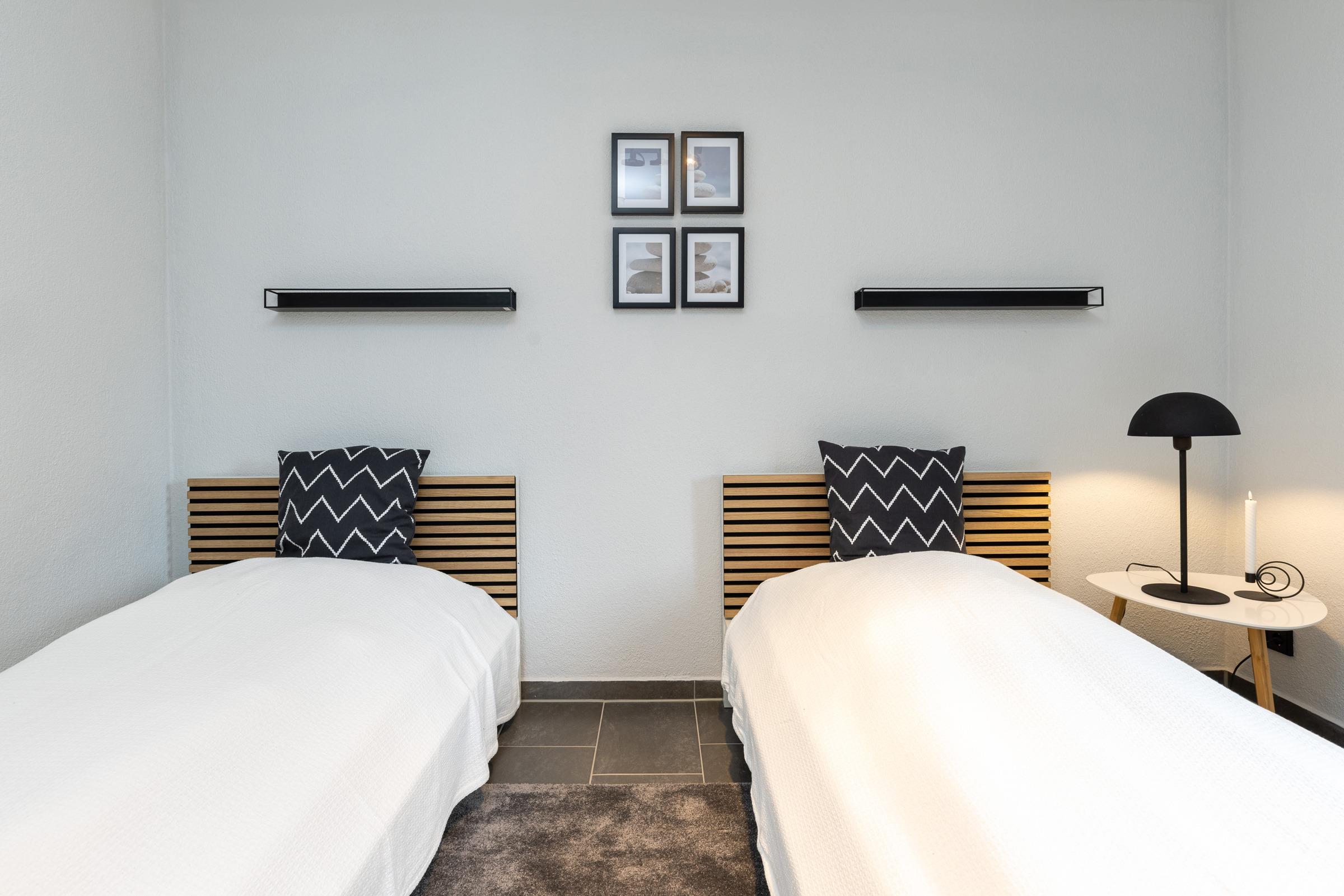 Der zweite Schlafraum ist mit zwei Einzelbetten (je 100x200 cm), Kleiderschrank und Sitzplatz ausgestattet und liegt auf der anderen Seite der Wohnung.