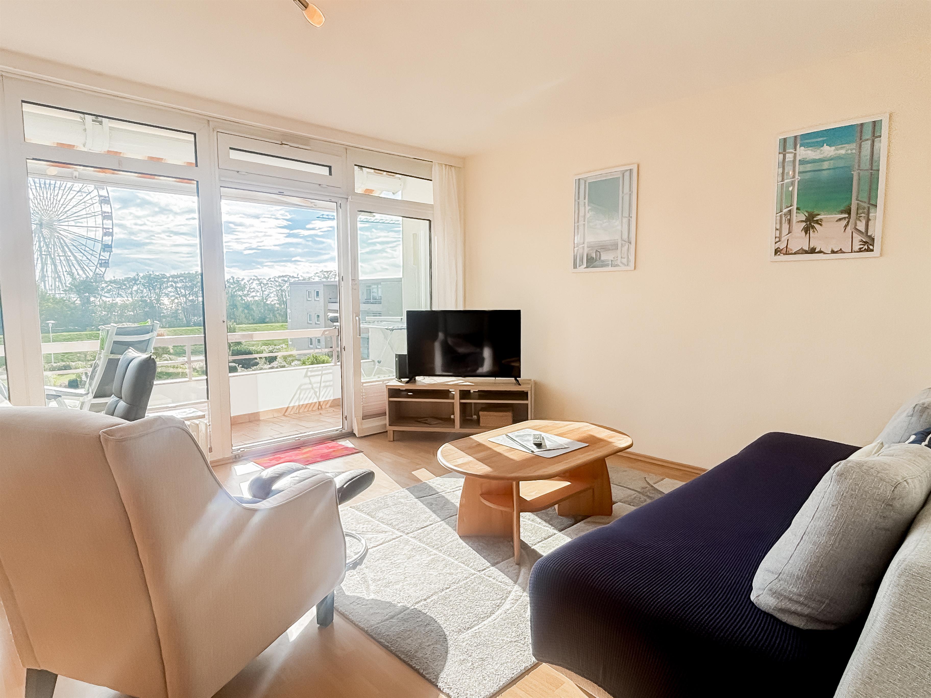 Das helle, geräumige Wohnzimmer ist möbliert mit einer neuen, gemütlichen Couchgarnitur (Schlafsofa für 1 Person), Essplatz für 4 Personen, Schrankwand, TV & Radio und hat Zugang zum sonnigen, möblierten Süd-Balkon. Von hier haben Sie ein bißchen Ostseeblick.