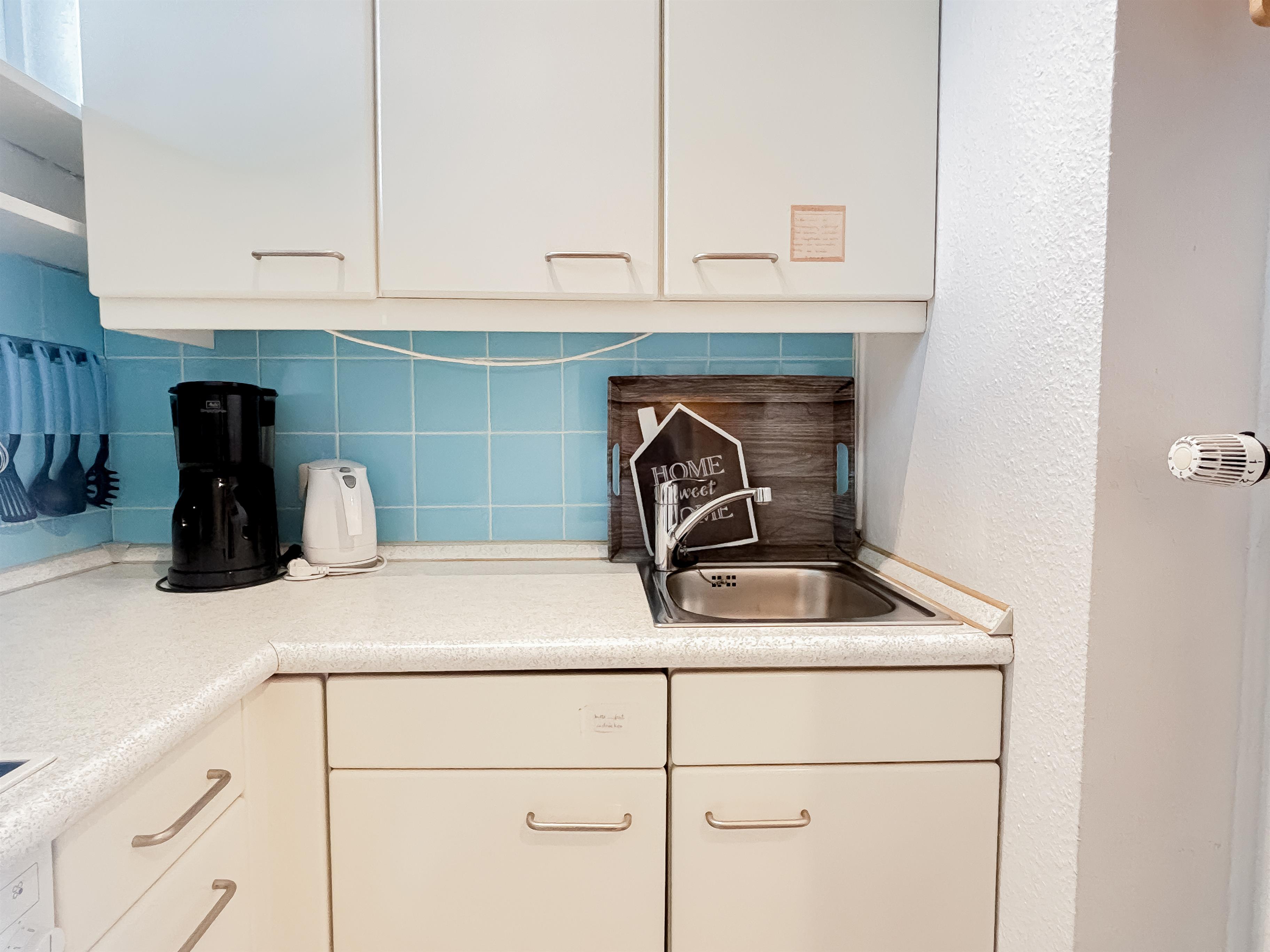 Die helle Küche ist mit Cerankochfeld, Backofen, Kühlschrank sowie allen üblichen Küchengeräten gut ausgestattet.