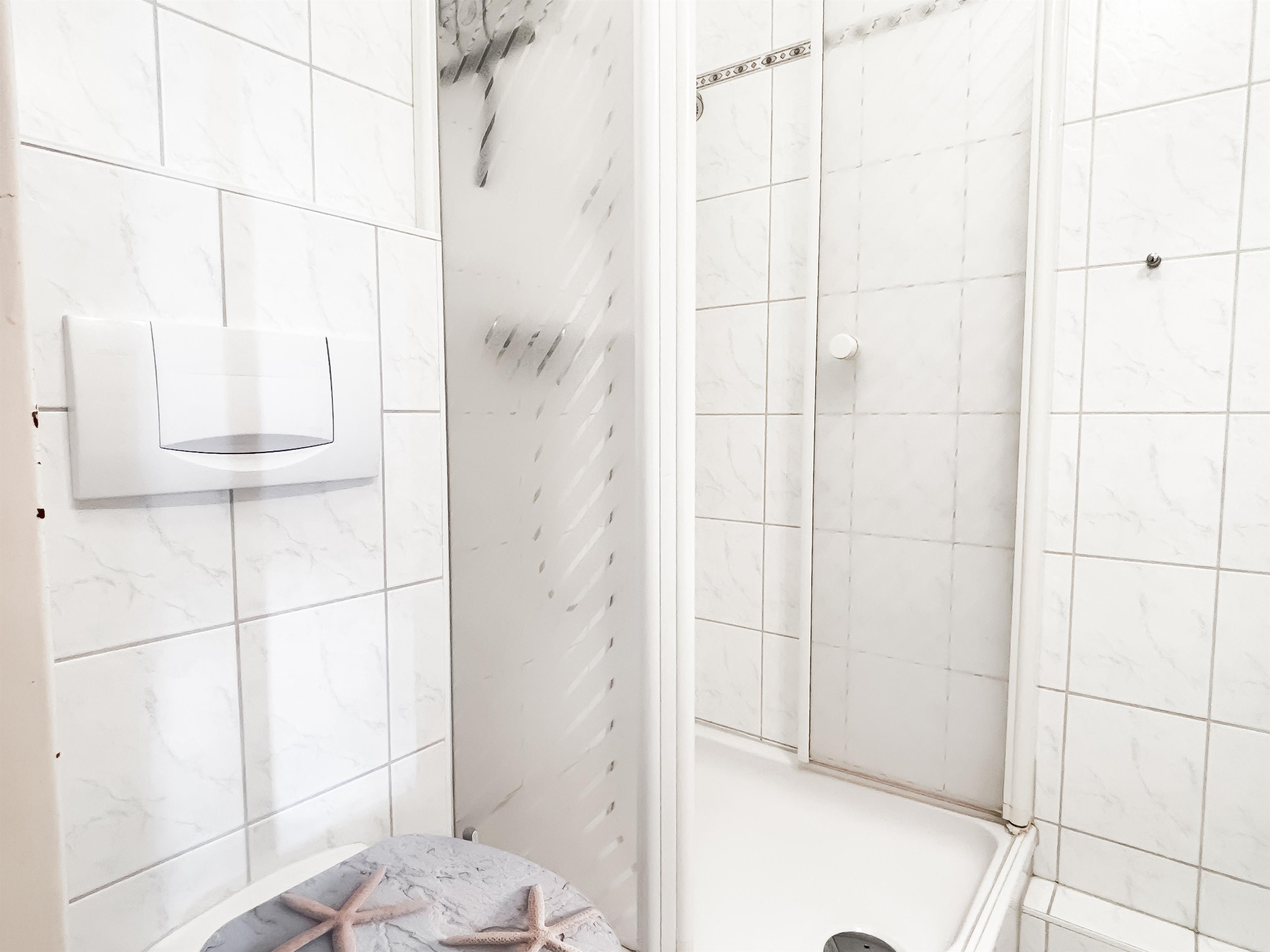 Hell gefließtes Bad mit Dusche + Trennwand, WC & Waschbecken.