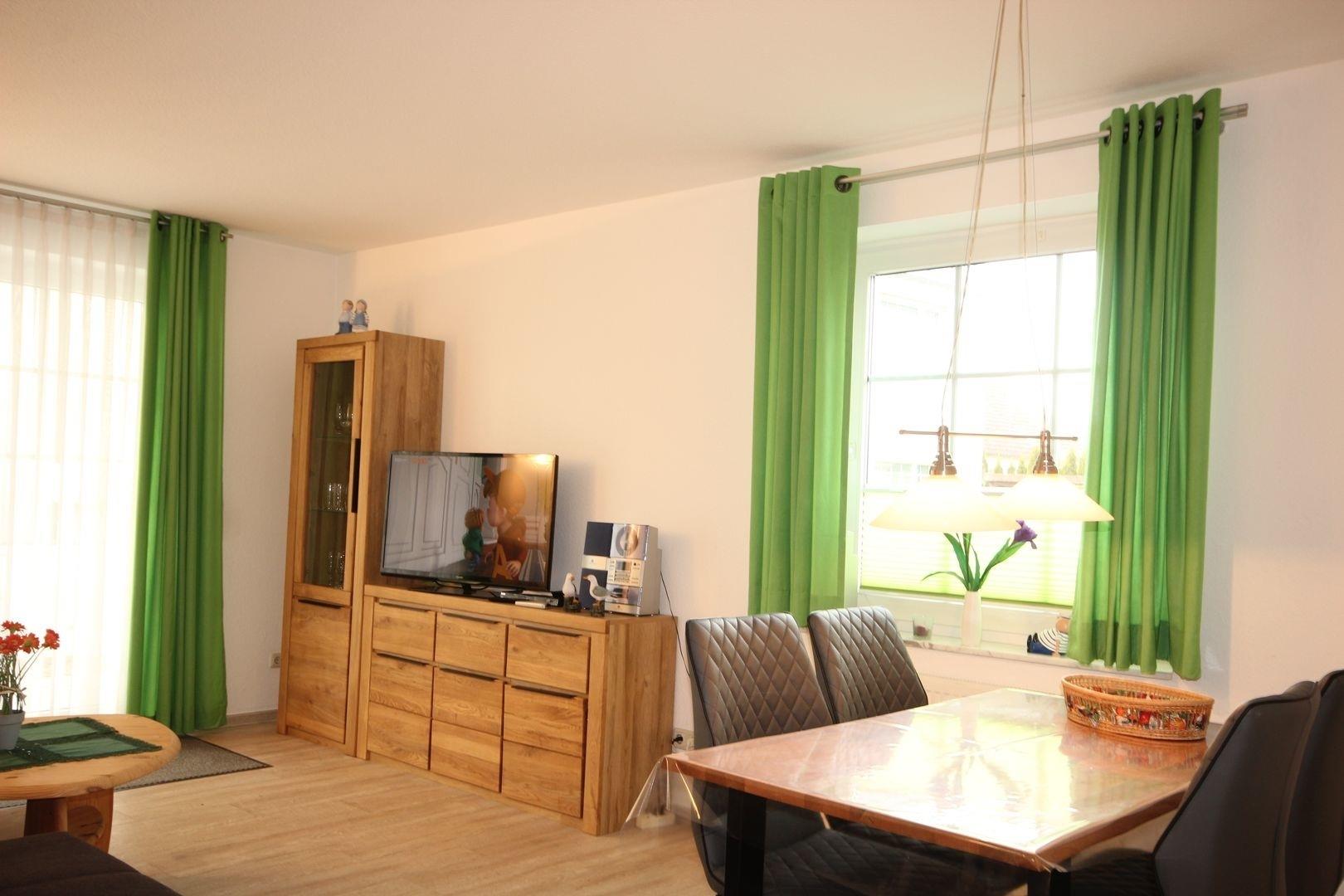 Im Wohnbereich befindet sich ein Essplatz für 4 Personen, Schrankwand mit TV und eine gemütliche Couchgarnitur zum Relaxen oder auch Schlafen für 2 Personen, sowie Zugang zur Terrasse. Hier können Sie die Urlaubstage genießen.