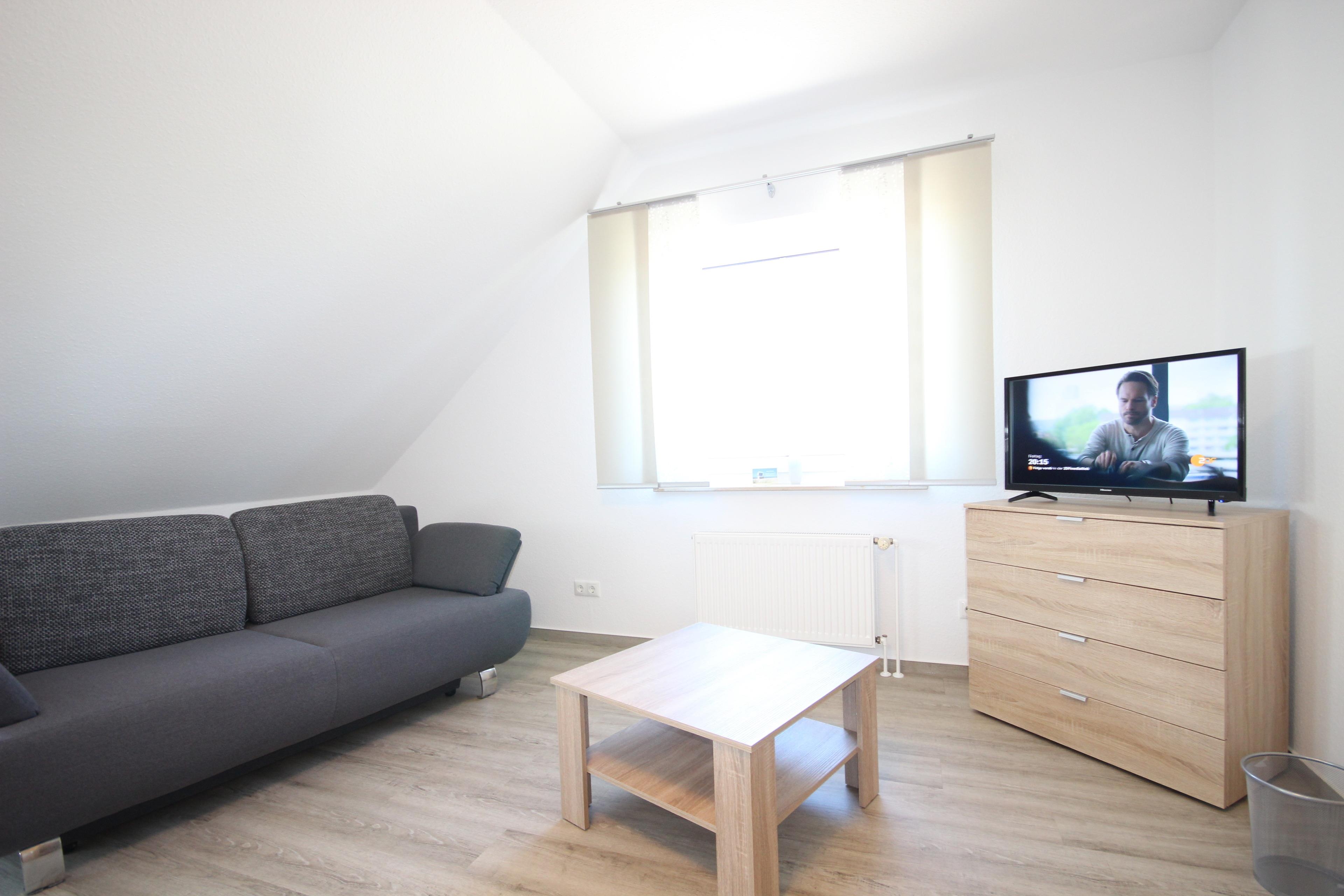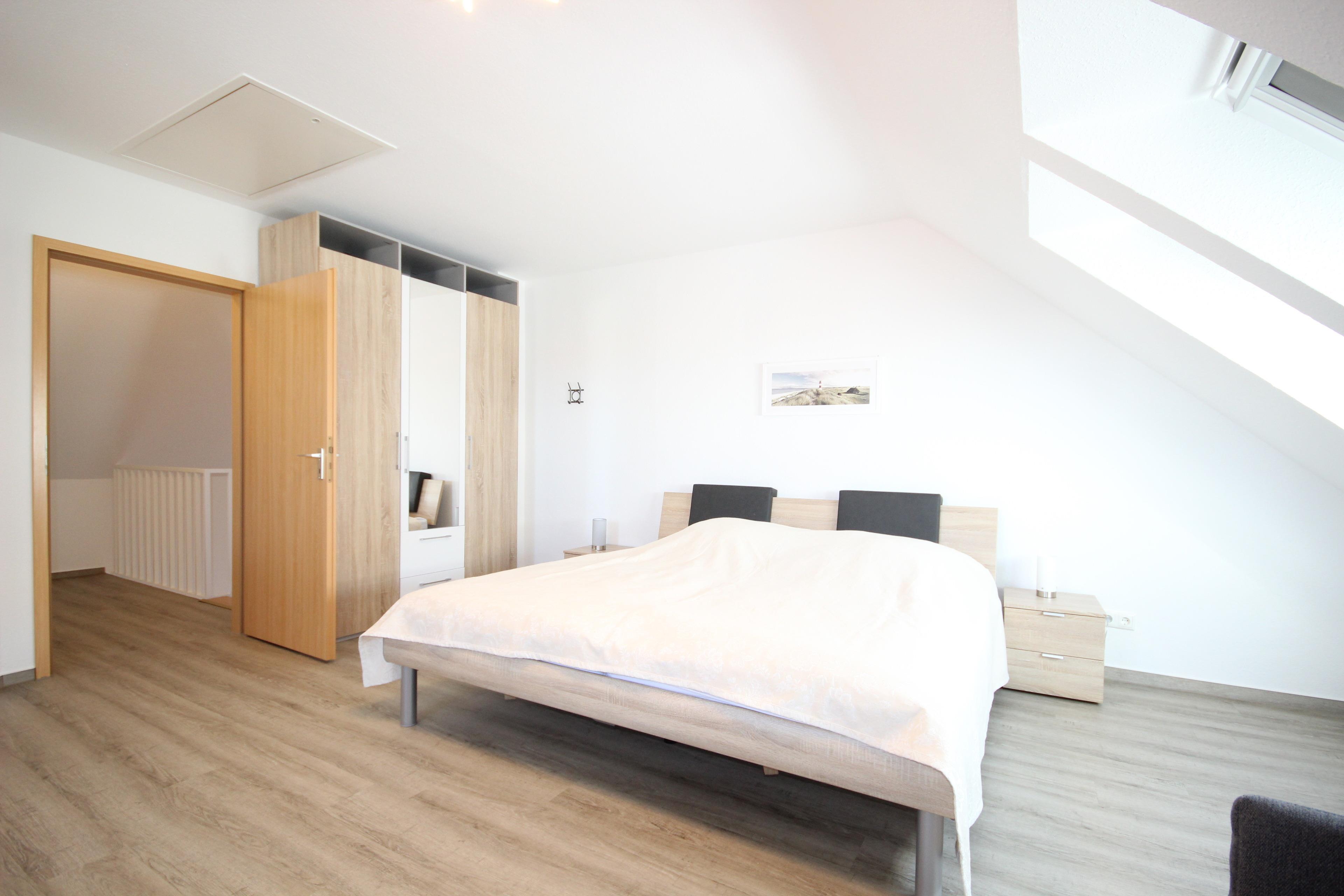 Im Dachstudio ist ein Ehebett, Sofa & TV sowie ein helles 2. Duschbad vorhanden.