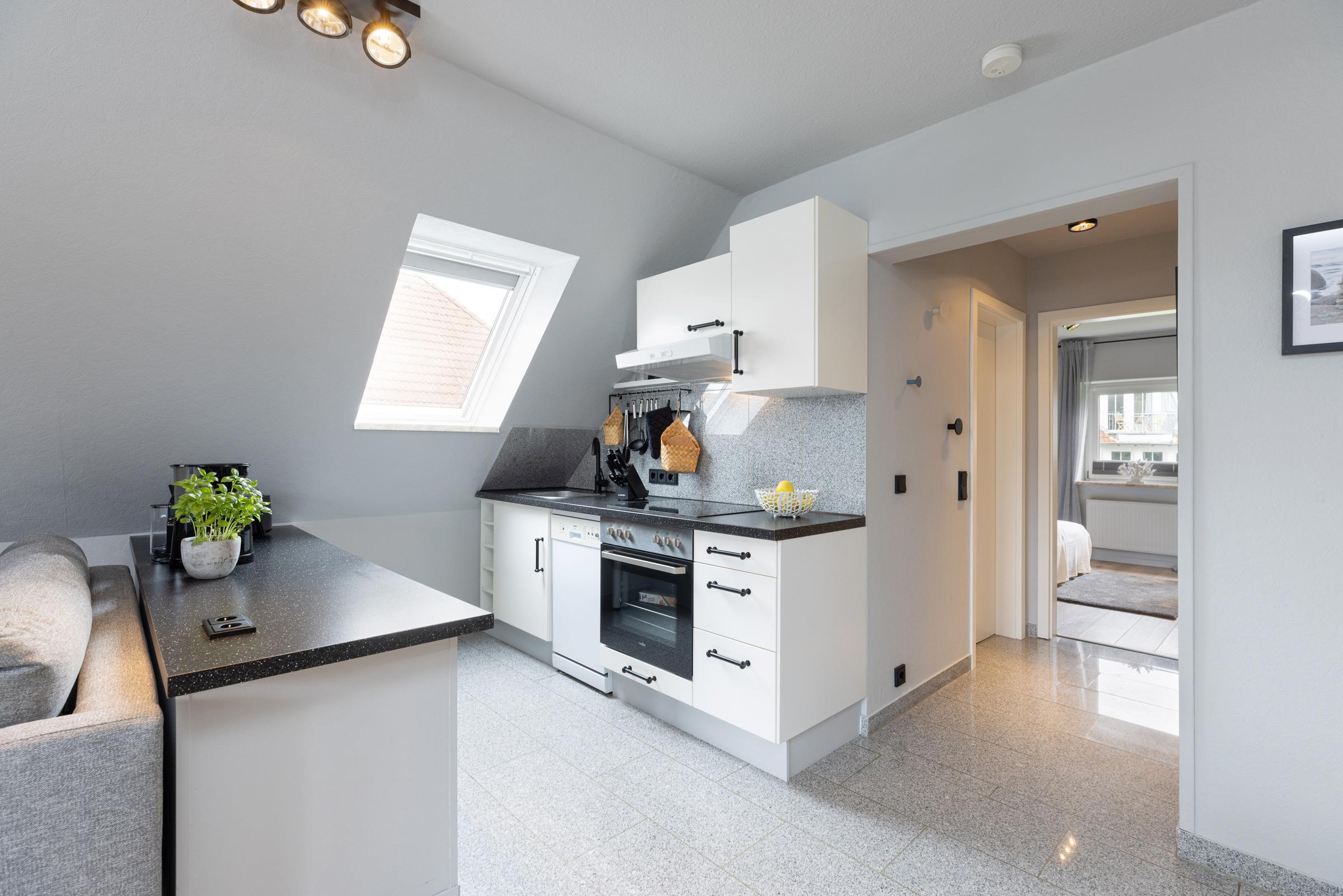 Die Mahlzeiten können - je nach Stimmung - am Fenster-Essplatz, am Esstresen der gut ausgestatteten Küche oder bei wärmender Sonne auf dem großzügigen Balkon mit Sonnenschirm eingenommen werden.