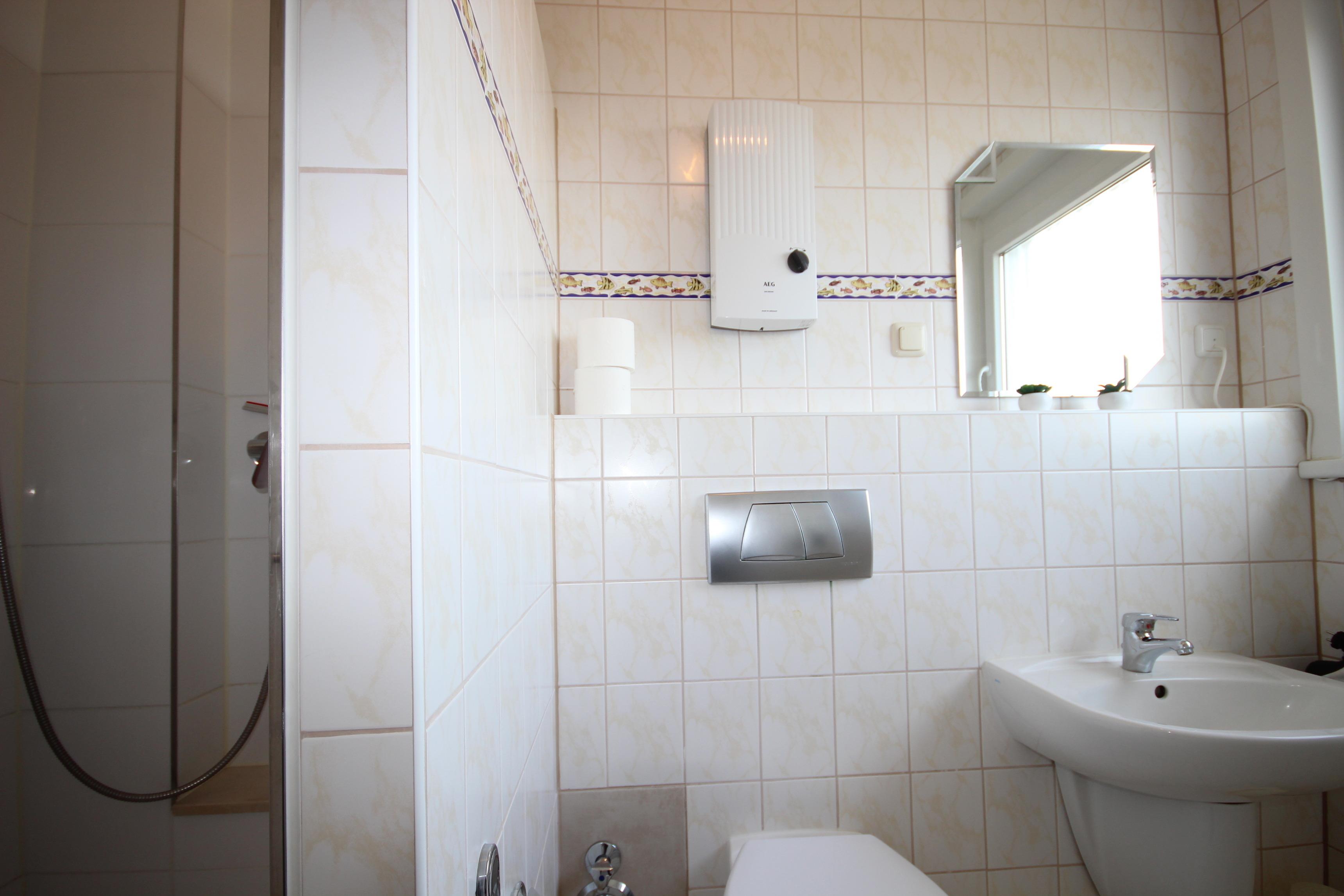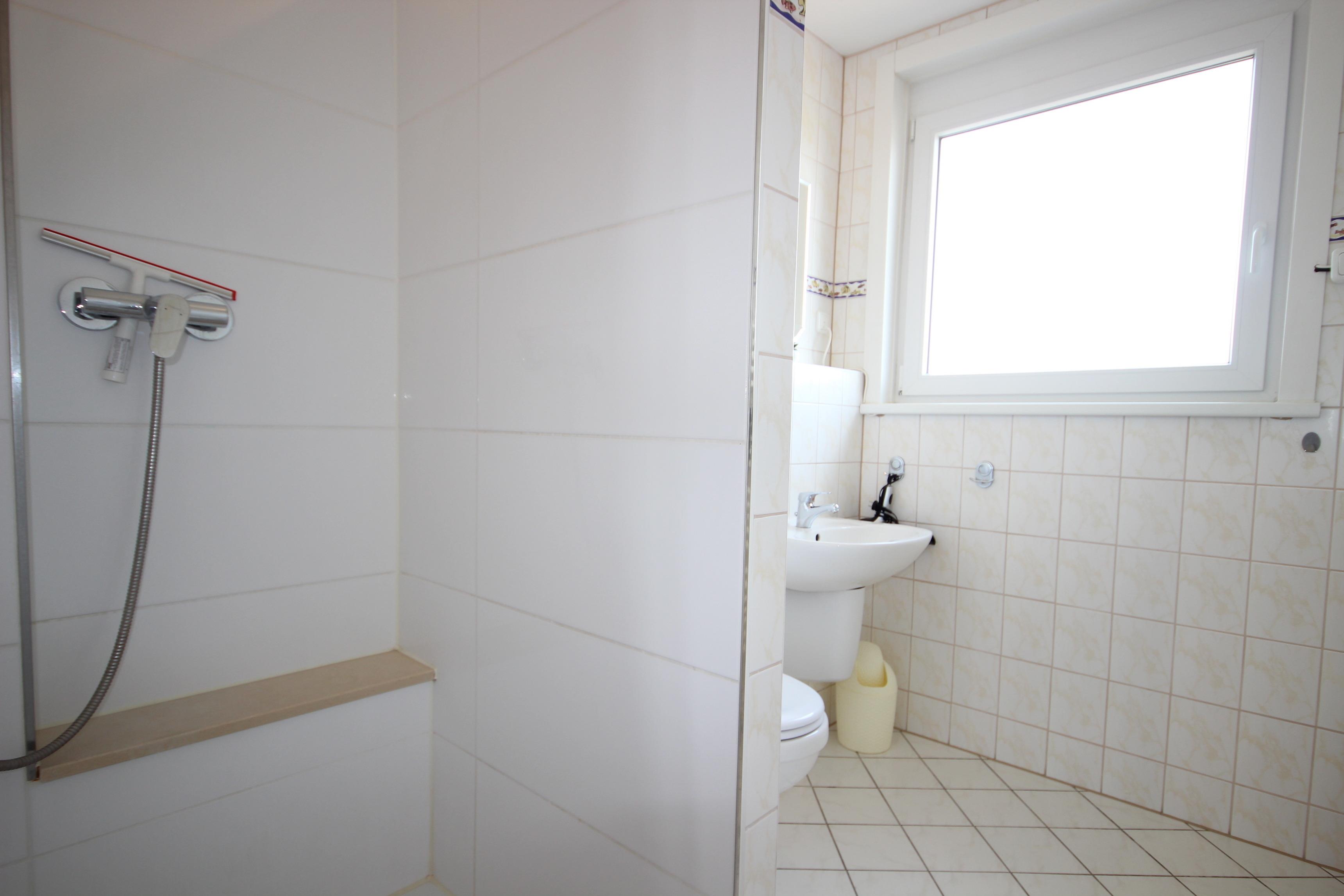 Im hell gefliesten Tageslicht-Bad ist eine abgetrennte geräumige Dusche , Waschbecken und WC.