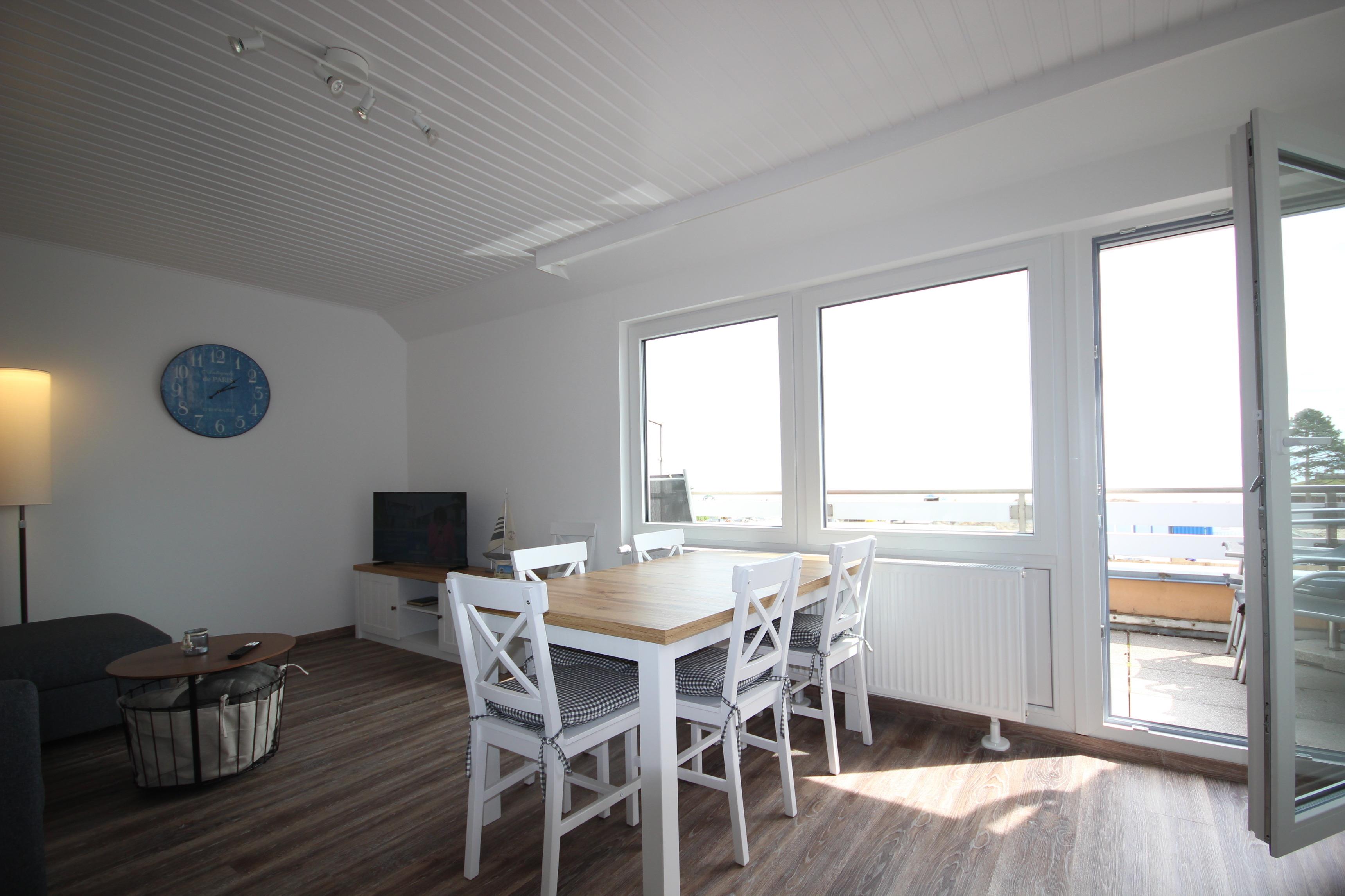 Das geräumige Wohnzimmer ist mit Sofaecke & Esstisch am Fenster, TV & Radio möbliert sowie Zugang zum Balkon mit herrlichem Ostsee-Blick.