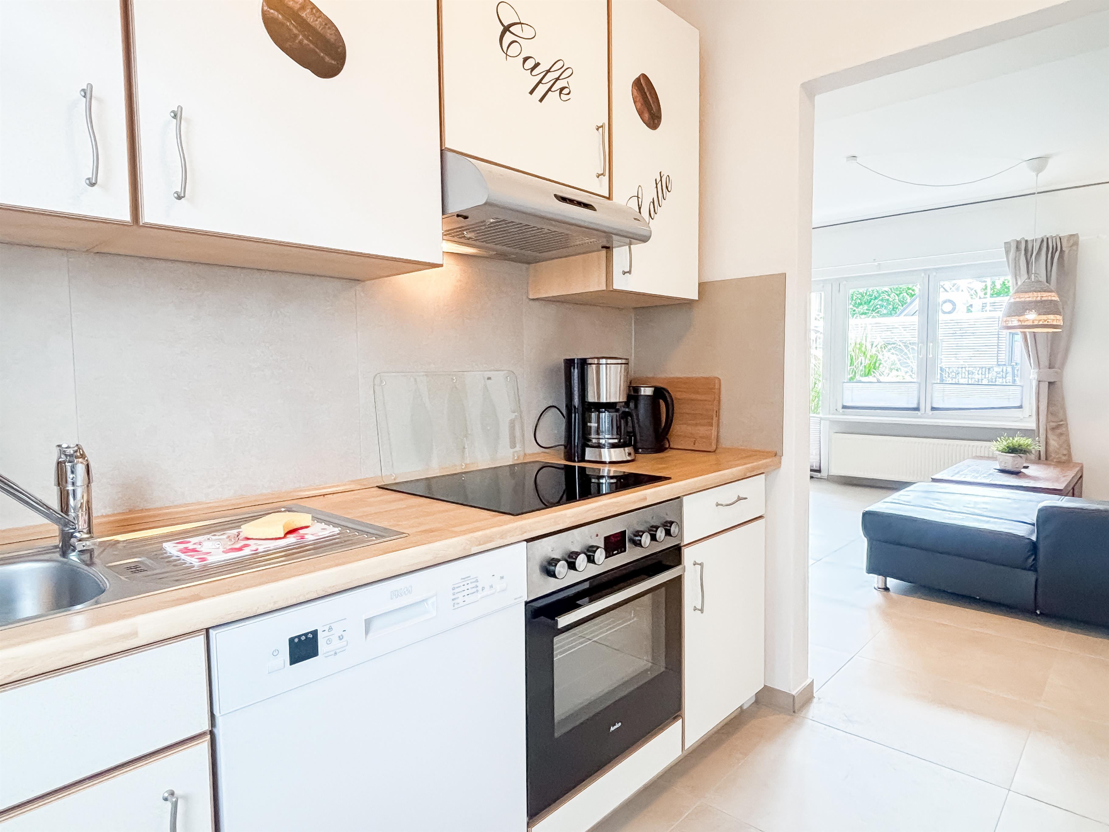 Die moderne Küche ist mit Ceran-Kochfeld, Backofen, Kühlschrank, Geschirrspüler und allen üblichen elektrischen Geräten sehr gut ausgestattet.