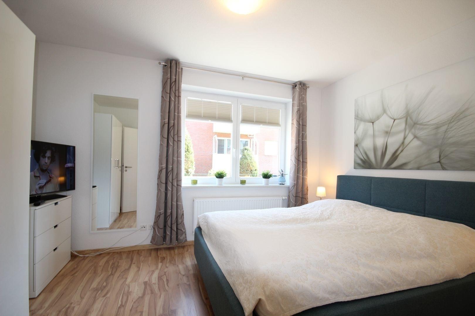 Im geräumigen Schlafzimmer steht ein Ehebett, Flachbild-TV & Kleiderschrank und Kommode.