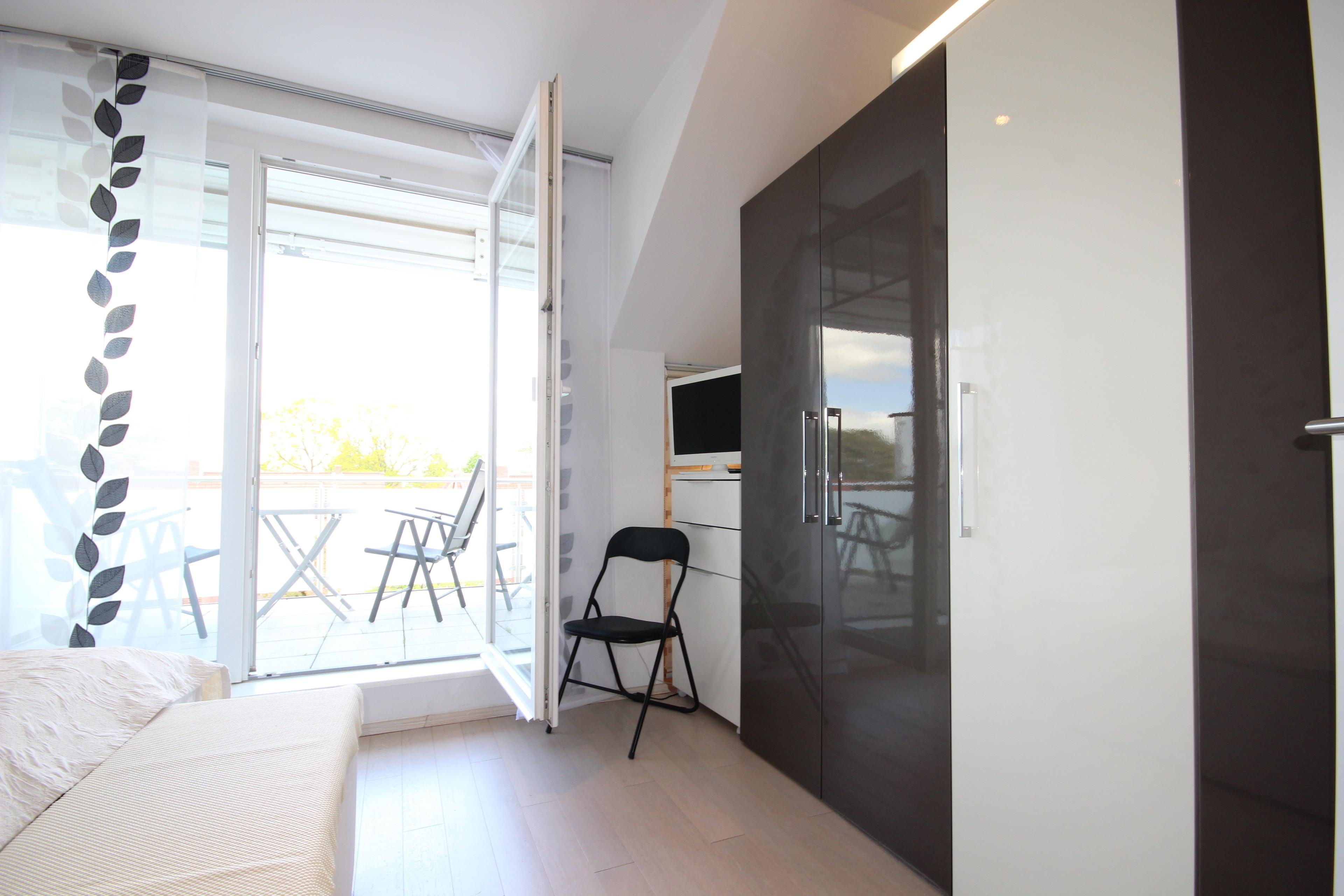 Das Schlafzimmer ist mit hellem Parkettboden versehen und verfügt neben einen großen Kleiderschrank mit Beleuchtung über TV sowie einen zusätzlichen Balkon auf dem Sie die Abendsonne genießen können.
