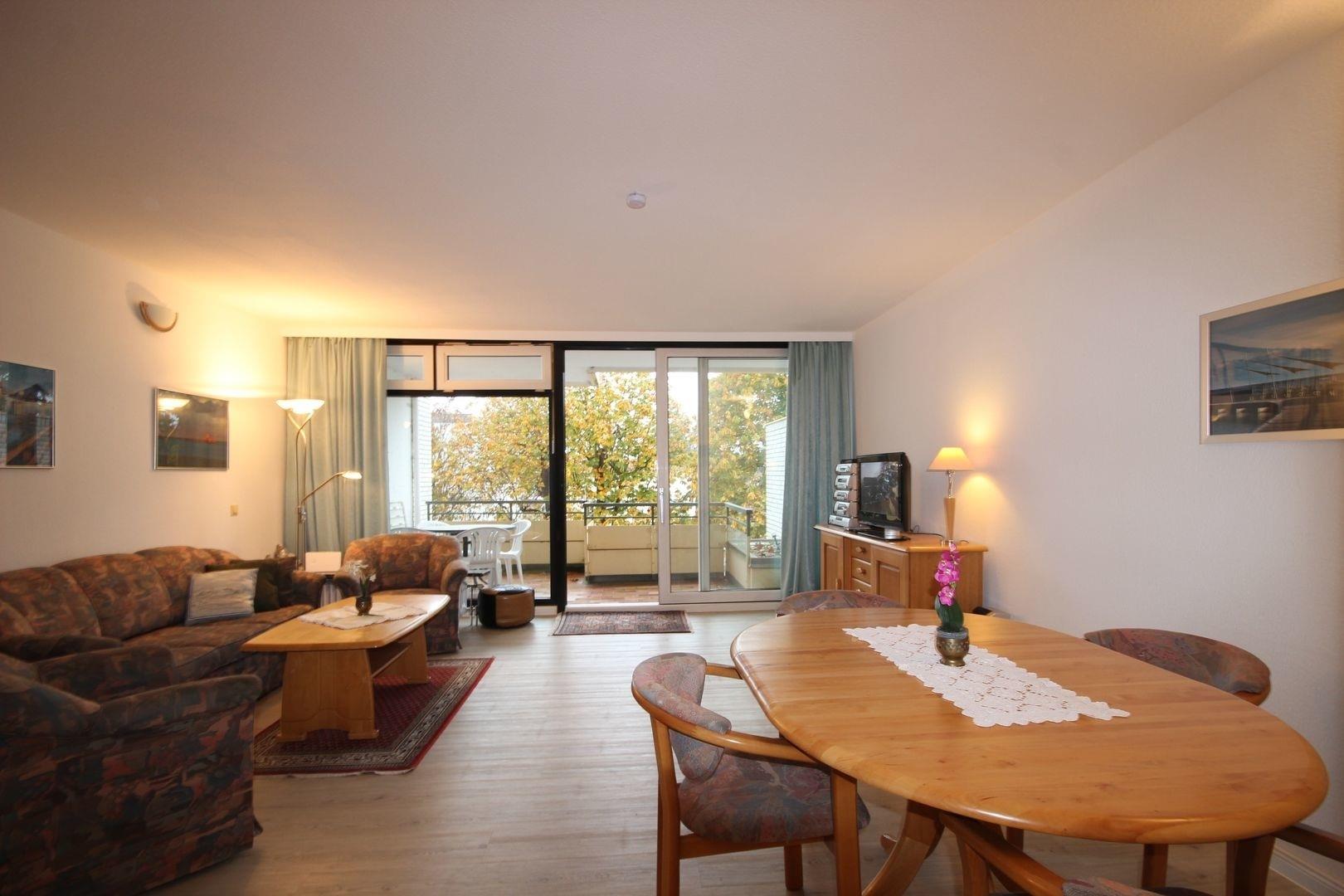 Das gemütliche Wohnzimmer mit Couchgarnitur, TV, Radio und Essplatz bietet Platz für die ganze Familie. Weiterhin befindet sich hier ein Schrankbett für 2 Personen (Breite ca. 160 cm). Hier haben Sie auch den Zugang zum Süd-West-Balkon.