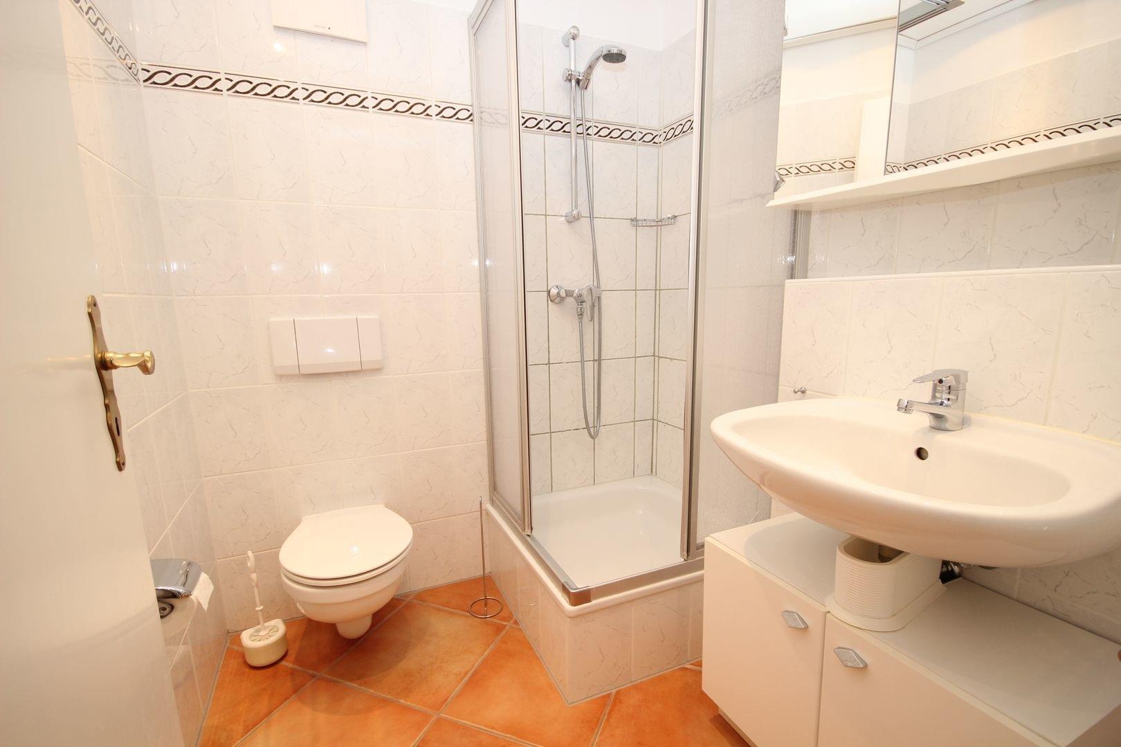 Hell gefliestes Bad mit Duschkabine, WC und Waschbecken.