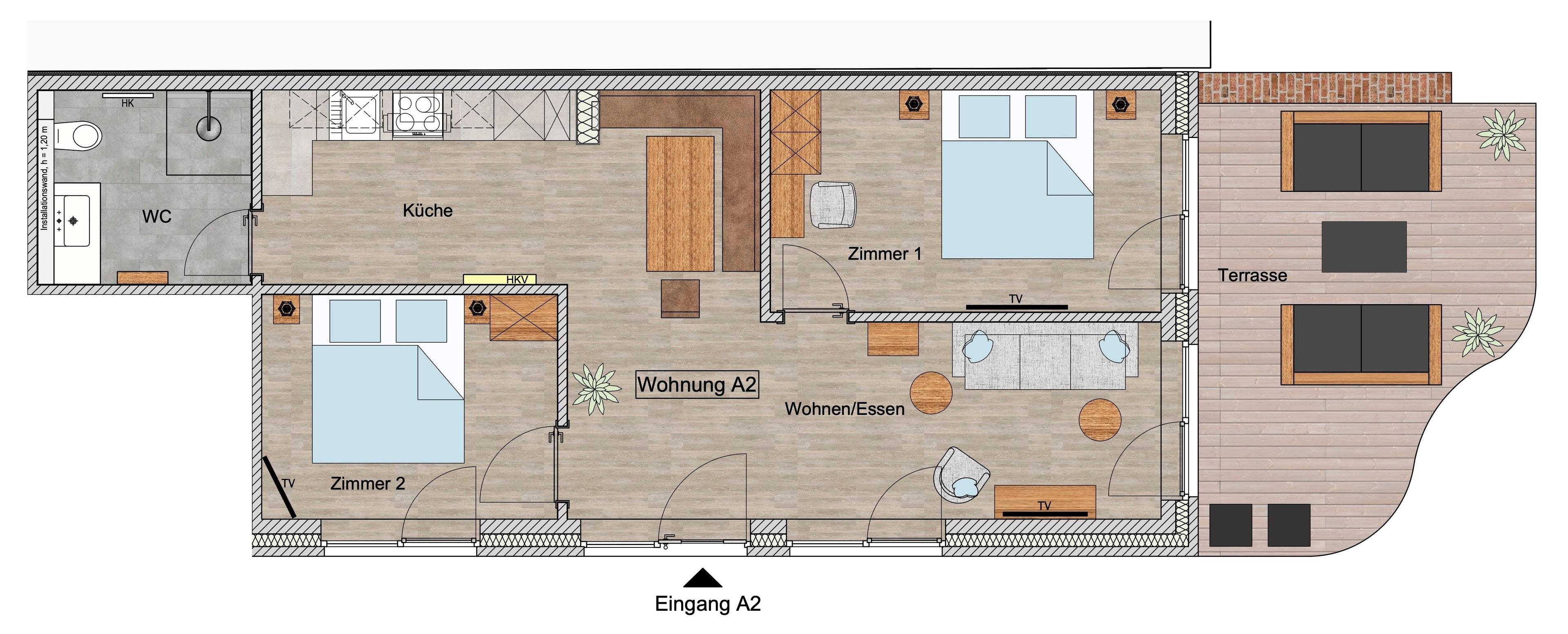 Das Apartment A2 ist ein Highlight dieser Ferienanlage. Vor allem die traumhafte 20 qm Terrasse ist ein besonderer Wohlfühl-Platz dieses Domizils. Darüber hinaus zeichnet sich die Wohnung durch eine geschmackvolle Einrichtung und beste Ausstattung aus. Modernste Technik und Interieur in edlem Design lassen Sie im Urlaub nichts vermissen, das Sie von zu Hause gewohnt sind.