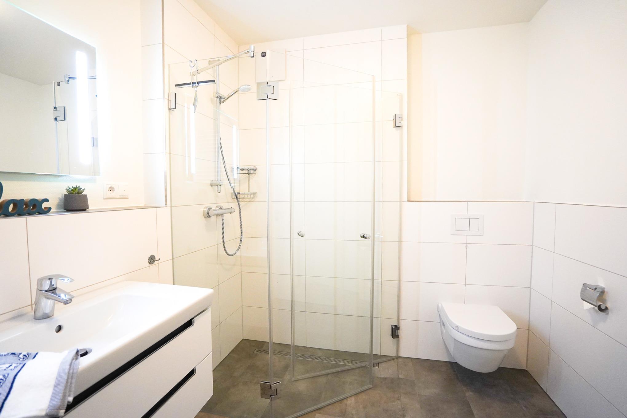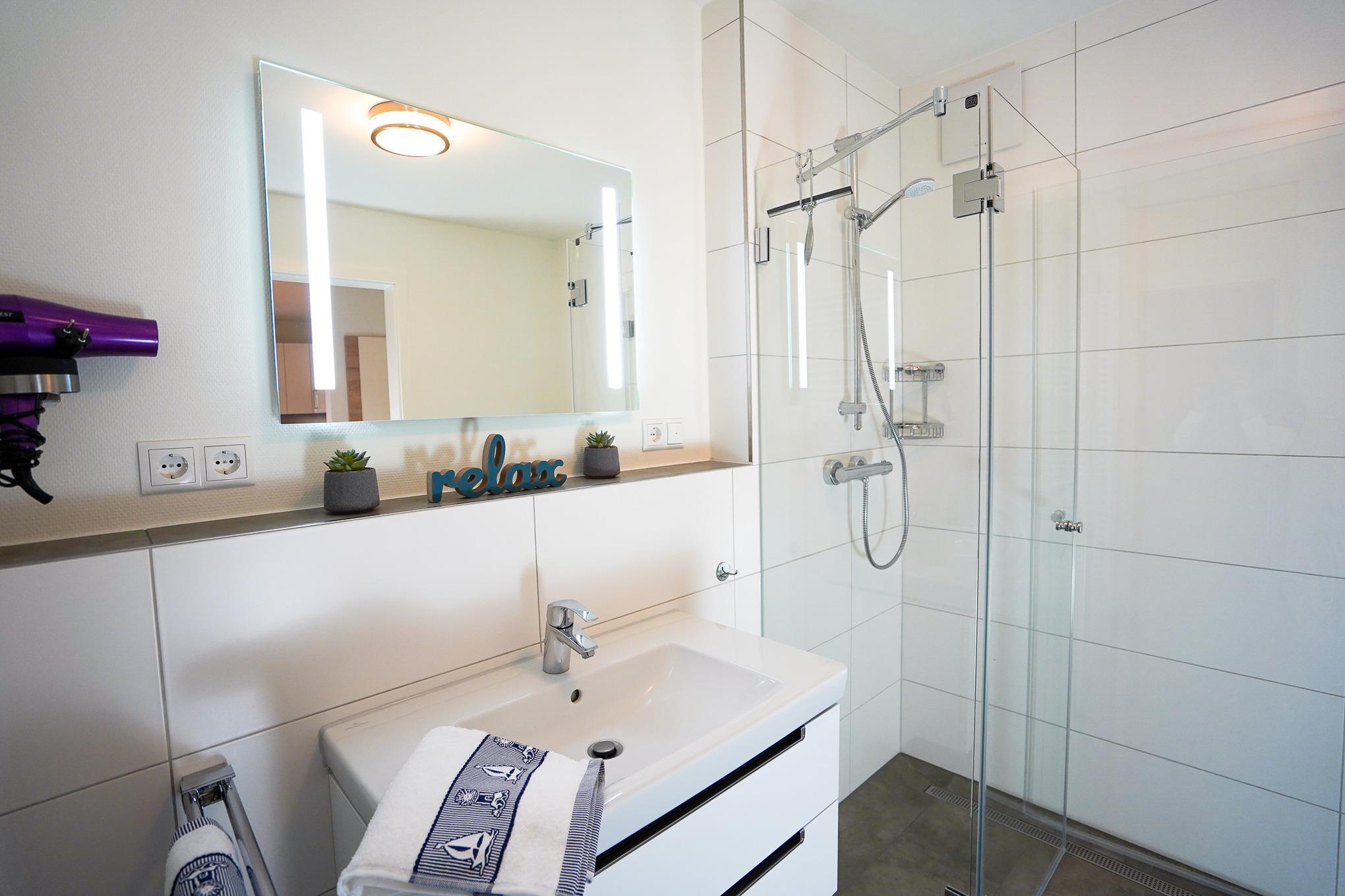 Im modernen Badezimmer mit bodengleicher Dusche finden Sie zusätzlich eine Waschmaschine zur kostenlosen Verwendung vor. Highlight ist hier die eigene Sauna, welche zur Entspannung einlädt.
