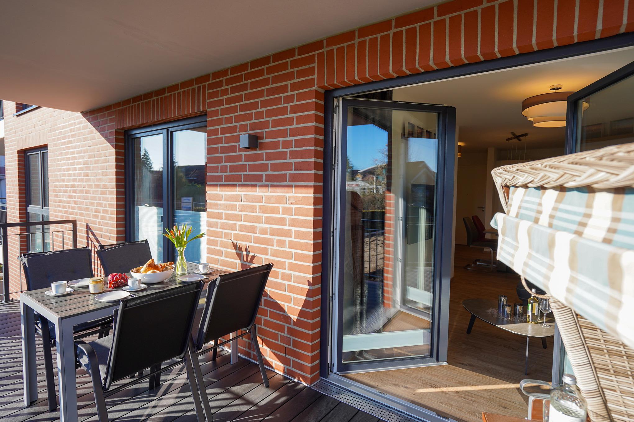 Diese Ferienwohnung lässt keine Wünsche offen. Das Herzstück bildet der große Balkon, der sich über den gesamten Wohn- und Schlafbereich erstreckt. Genießen Sie Ruhe und Entspannung in Ihrem gemütlichen Strandkorb oder an Ihrem großzügigen Esstisch.