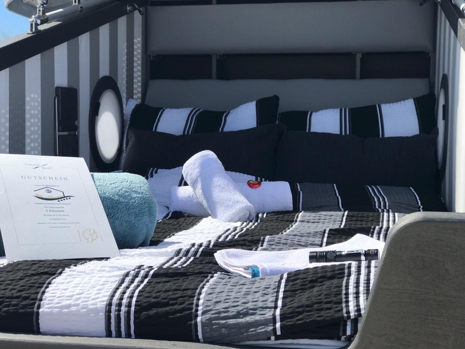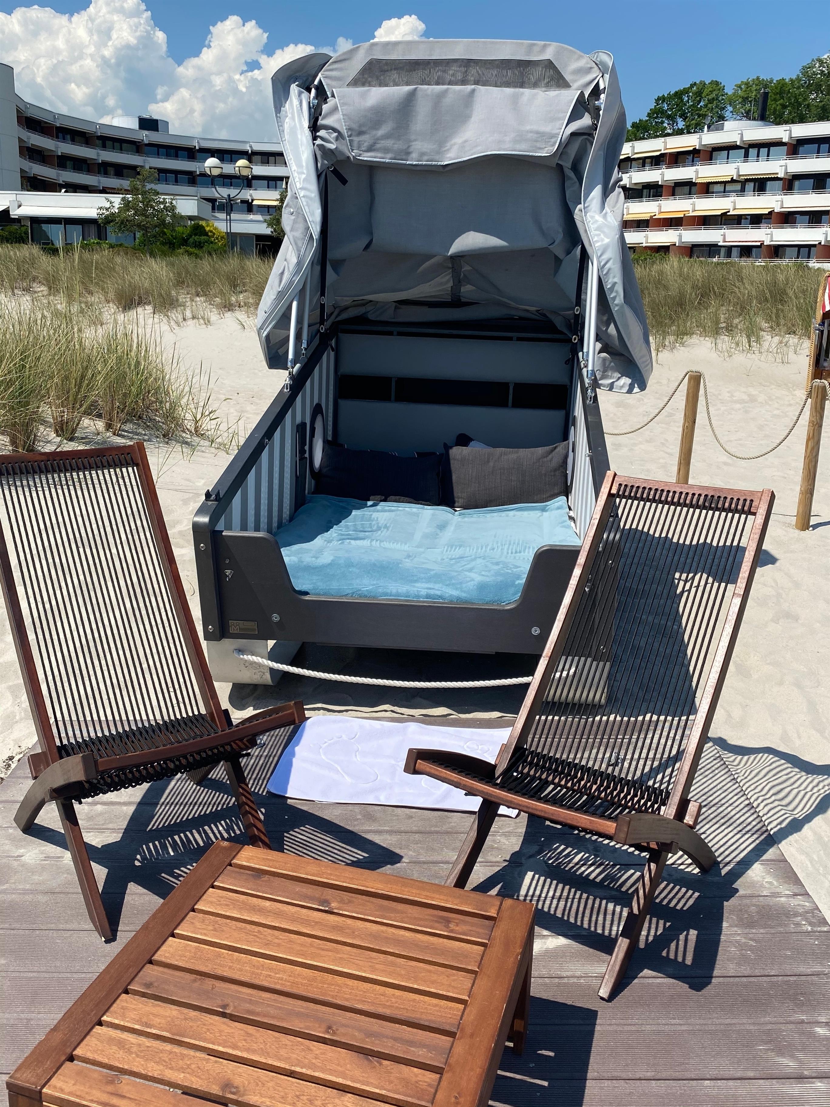 Romantischer Schlafstrandkorb für zwei Gäste direkt am Strand mit Ostseeblick in Grömitz.