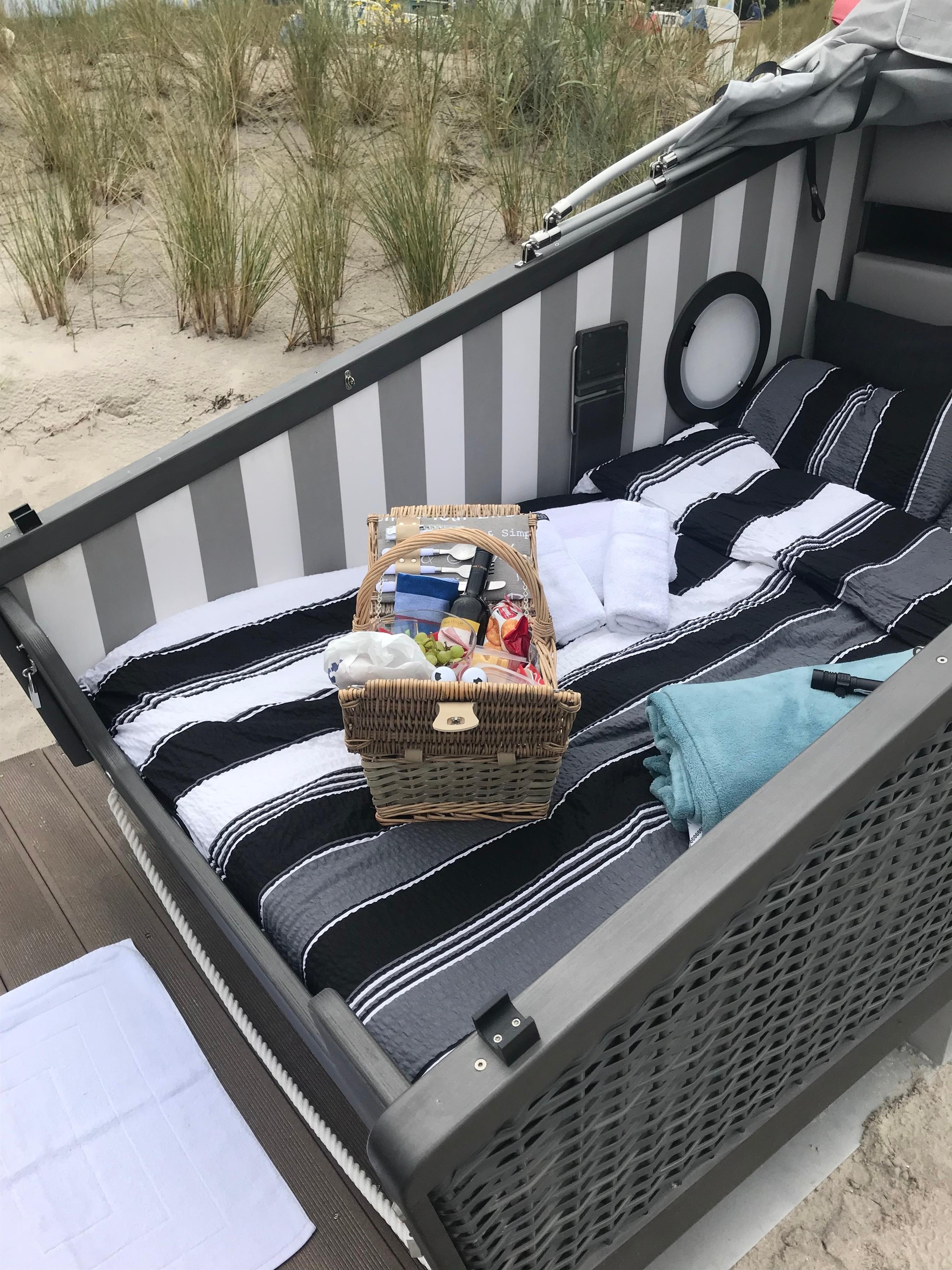 Romantischer Schlafstrandkorb für zwei Personen direkt am Strand von Grömitz mit Ostseeblick.