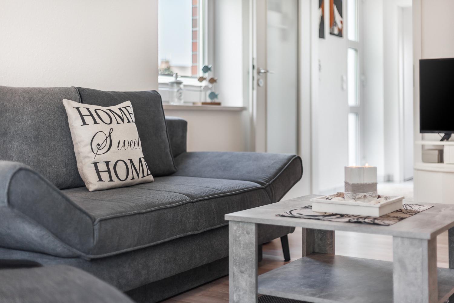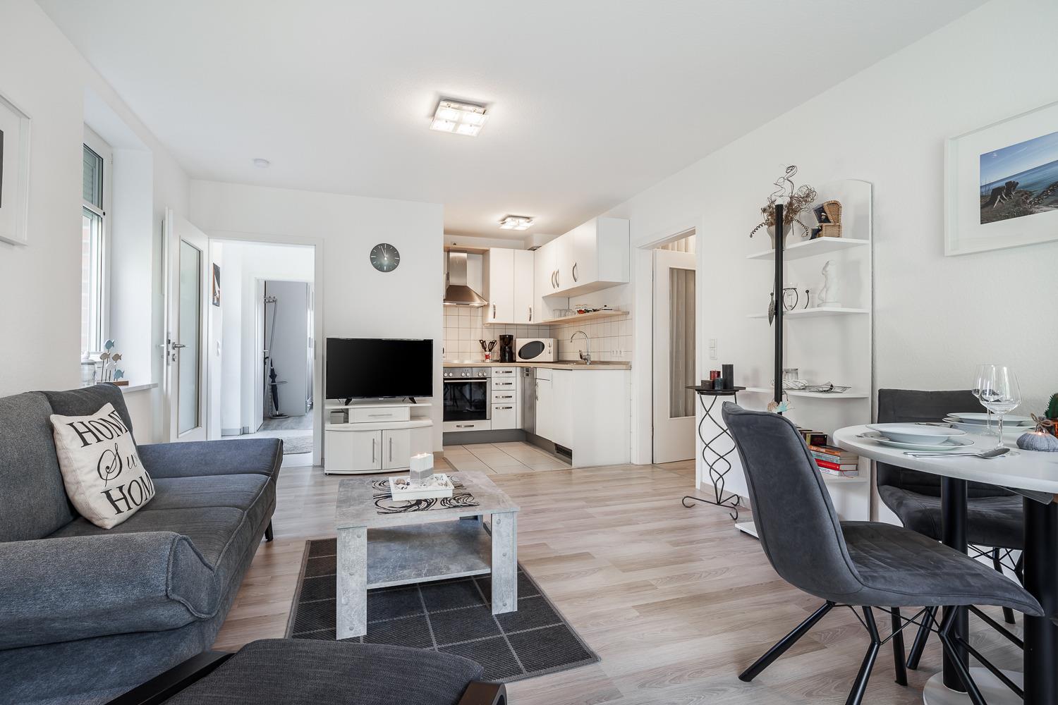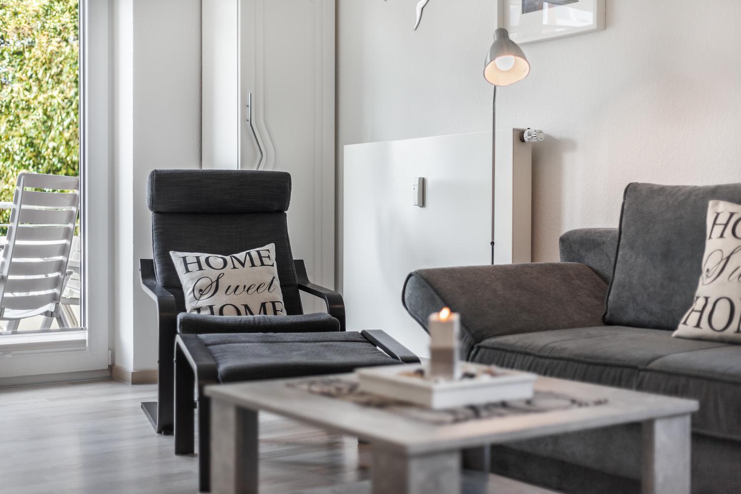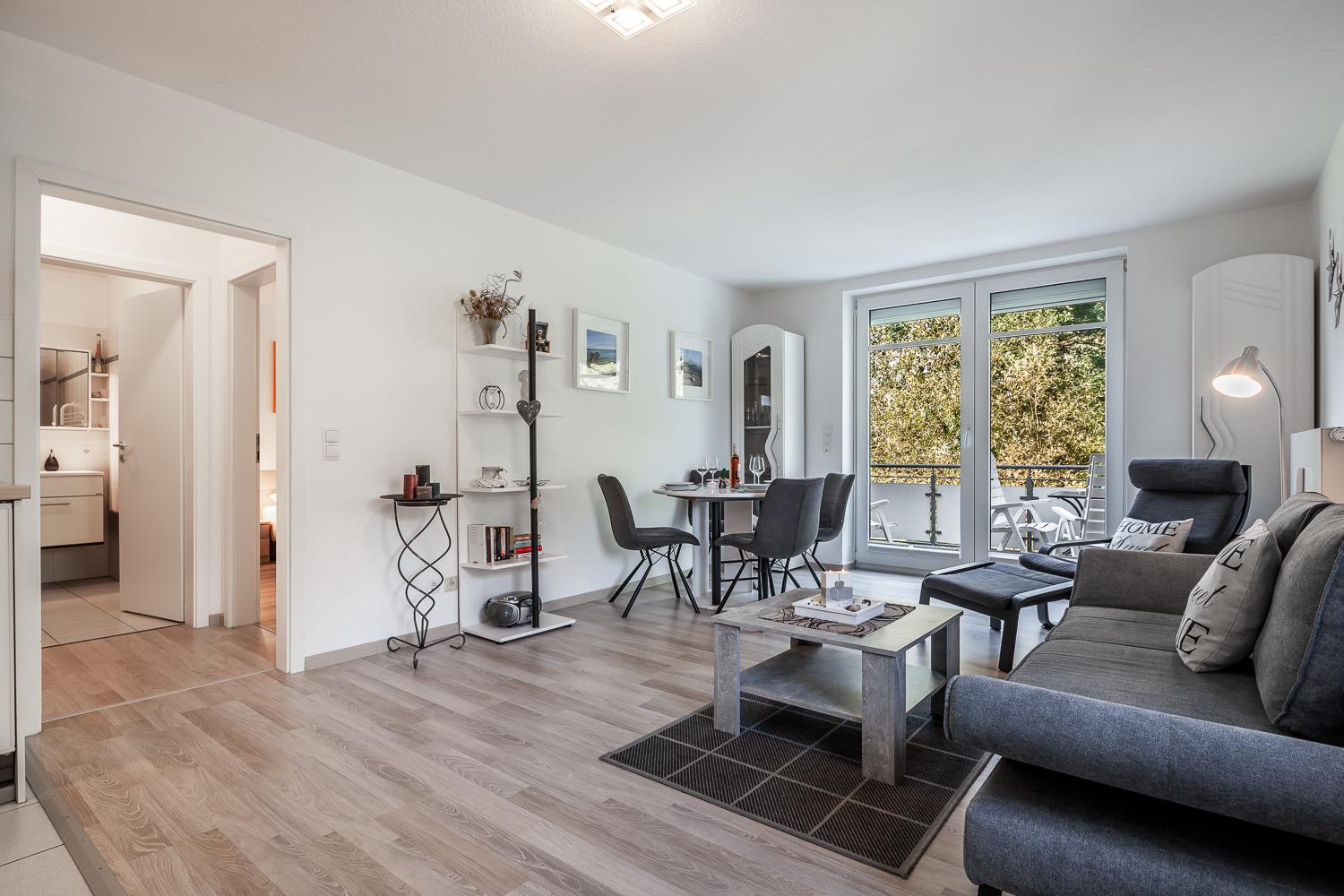 Das gemütliche Wohnzimmer ist mit genügend Sitzmöglichkeiten und einem Flat-TV ausgestattet. Von hier aus gelangen Sie auf den sonnigen und ins Grüne ausgerichteten Balkon.