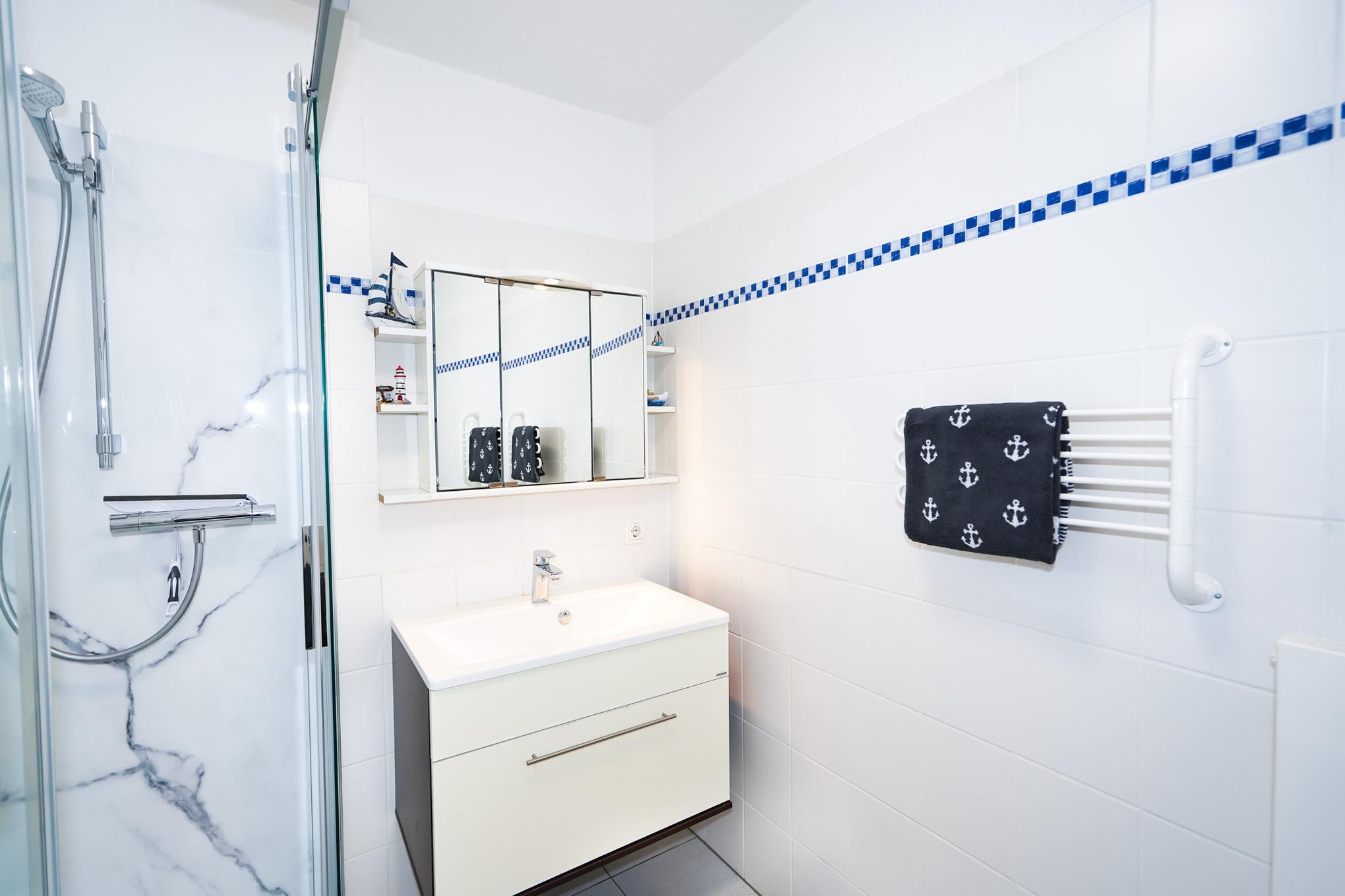 Die Wohnung verfügt über zwei getrennte Schlafräume, worin sich jeweils ein Doppelbett (1,80 x 2,00 m / jeweils 2 Matratzen) befindet. Beide Schlafzimmer haben ein dazugehöriges Duschbad. Das ist Urlaub - kein langes Anstehen vor dem Badezimmer.