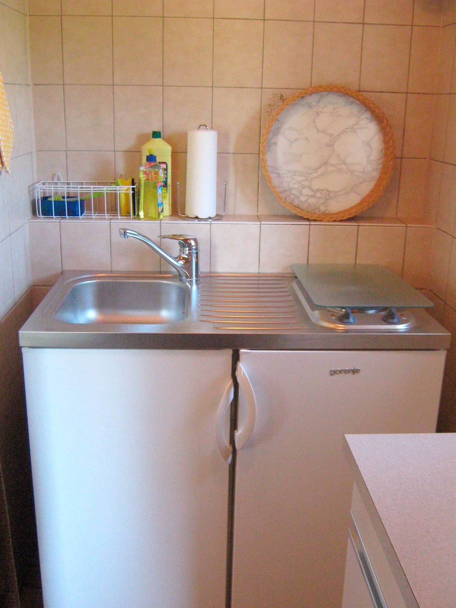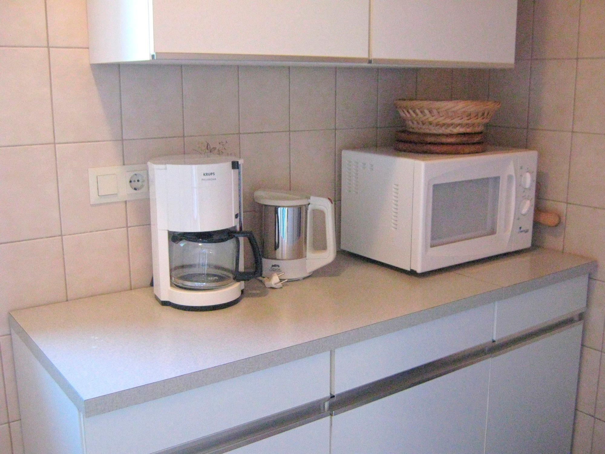 Die Wohnfläche verteilt sich auf ein Wohn- / Schlafzimmer mit zwei Einzelbetten, TV und Sitzecke sowie auf die offene kleine Küche, u.a. mit Mikrowelle, 2-Plattenherd sowie Kaffeemaschine ausgestattet.