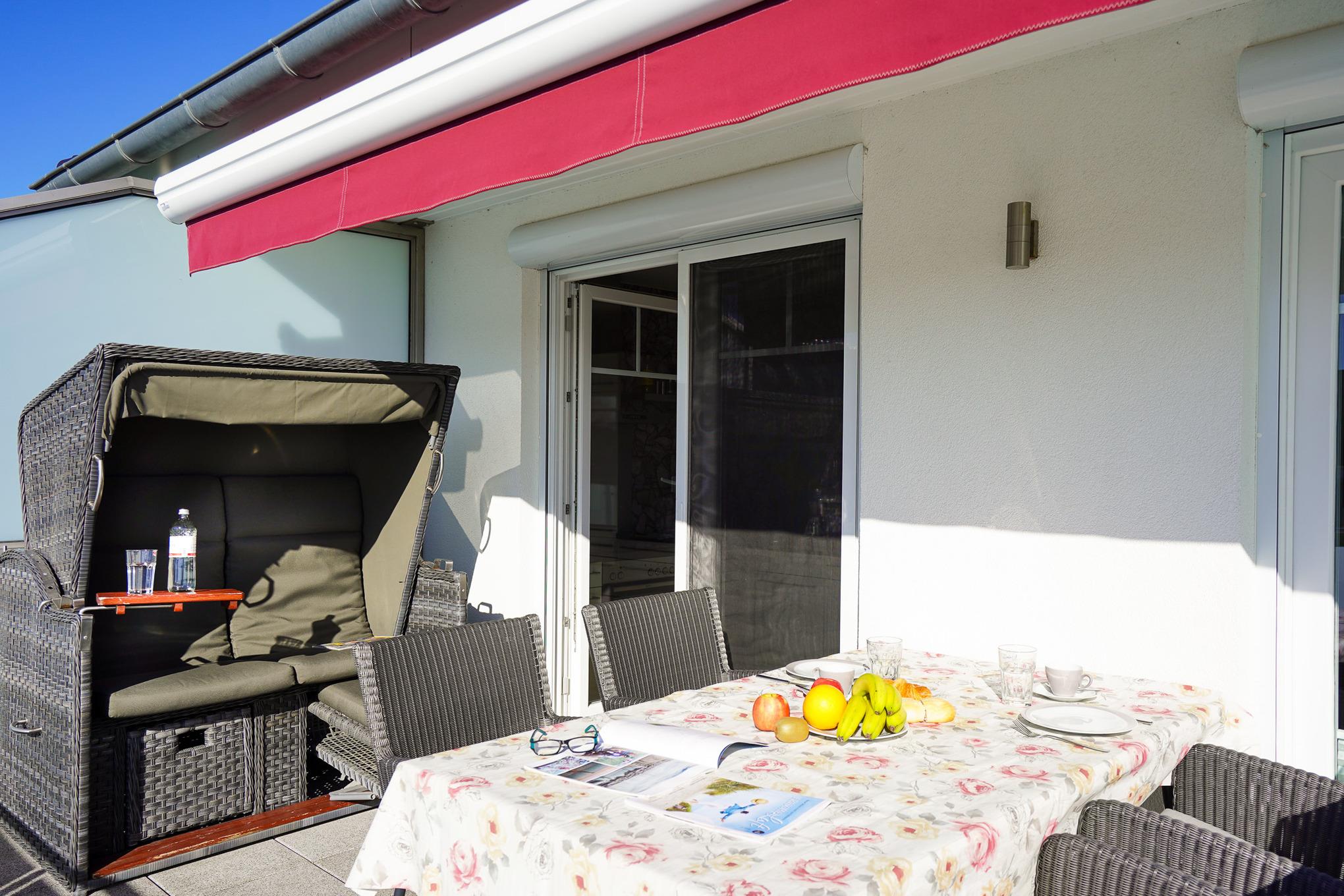 Diese Ferienwohnung lässt keine Wünsche offen. Das Herzstück bildet die große Dachterrasse, die sich in sonniger Südwestlage über den kompletten Wohn- und Küchenbereich erstreckt. Genießen Sie Ruhe und Entspannung in Ihrem gemütlichen Strandkorb, auf der vorhandenen Liege oder an Ihrem großzügigen Esstisch. Bei zu viel Sonnenschein steht Ihnen die elektrisch betriebene Markise zur Verfügung.