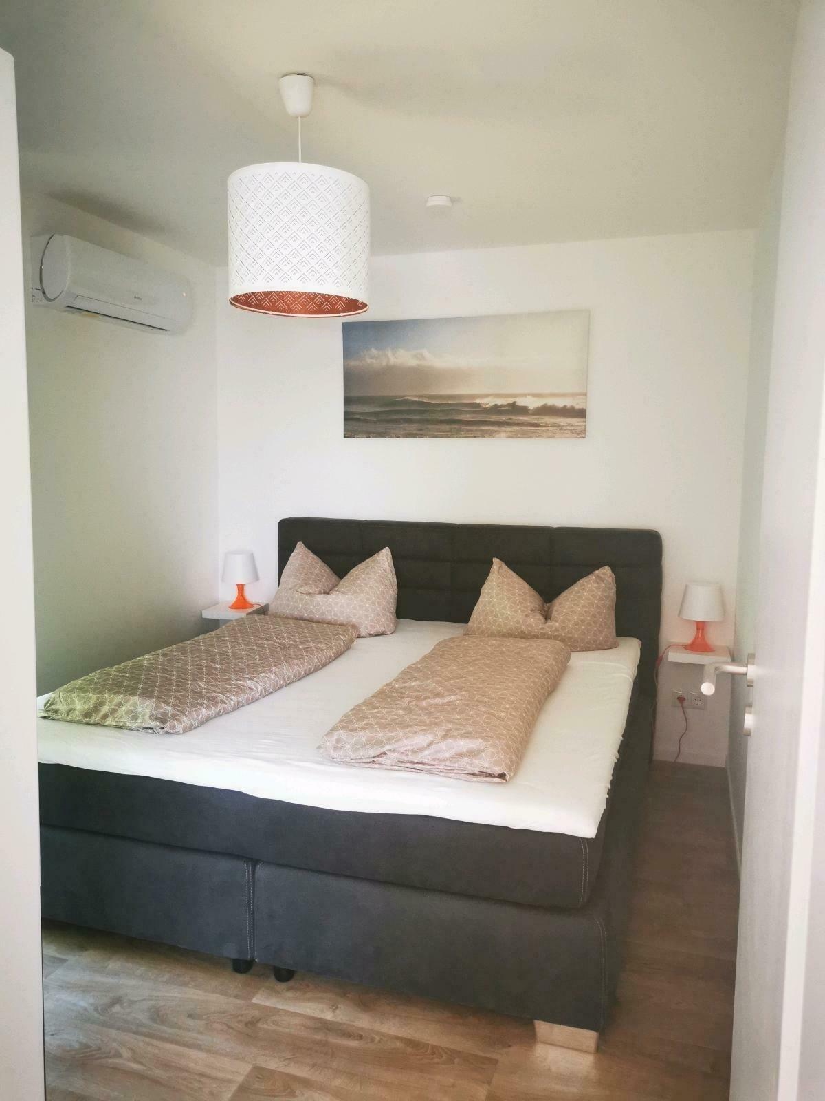 Außerdem bietet die Unterkunft zwei Schlafzimmer. In dem einen befindet sich ein Boxspringbett (180 x 200) und in dem anderen Zimmer finden Sie ein Hochbett.